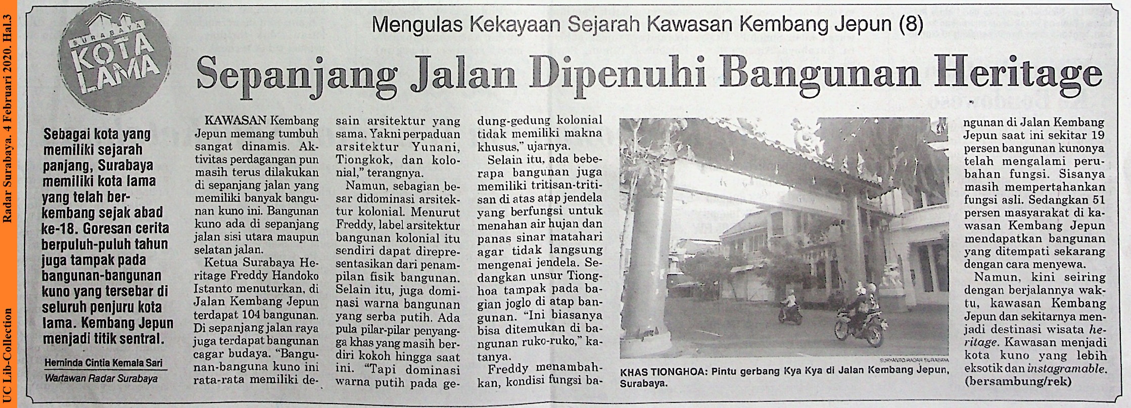 Namun, kini seiring dengan berjalannya waktu, kawasan Kembang Jepun dan sekitarnya menjadi destinasi wisata heritage, kawasan menjadi kota kuno yang lebih eksotik dan instagrammable. (bersambung/rek)
