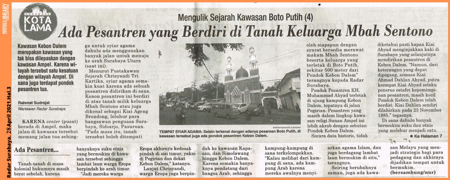 Menurut Pustakawan Sejarah Chrisyandi Tri Kartika, syiar agama semakin kuat karena ada sebuah pesantren ini berdiri di atas tanah milik keluarga Mbah Sentono atau juga dikenal sebagai Kiai Ageng Brondong, leluhur para bangsawan pengusaha Surabaya, Sidoarjo, Pasuruan. “Pada masa itu, tanah tersebut boleh ditempati oleh siapapun dengan syarat bersedia merawat makam Mbah Sentonon beserta keluarga yang terletak di Boto Putih, sekitar 500 meter dari Pondok Kebon Dalem” terangnya kepada Radar Surabaya.