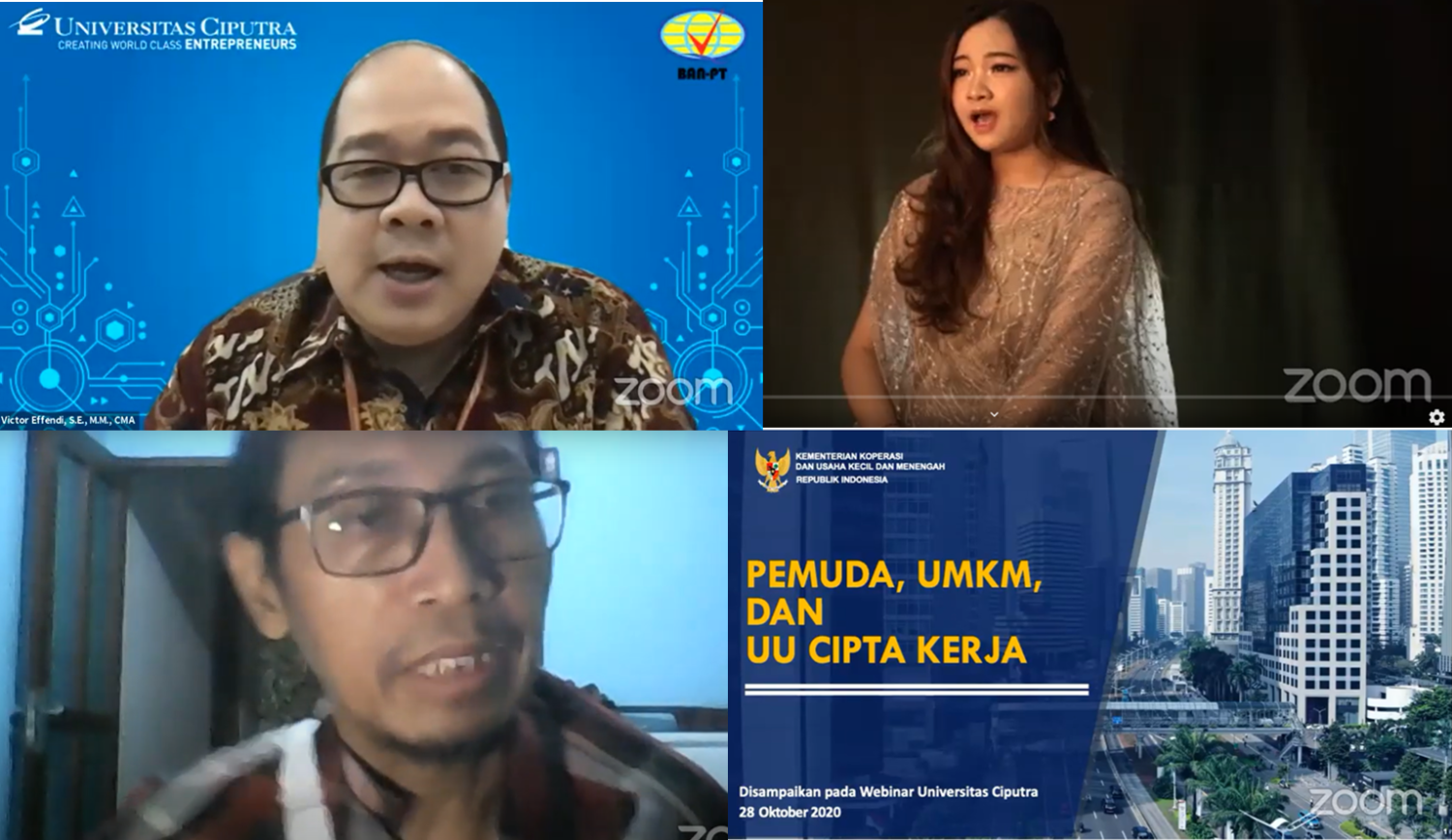 Memperingati hari Sumpah Pemuda 2020, Universitas Ciputra dalam hal ini Fakultas Entrepreneurship dan Humaniora (FEH), Biro Mahasiswa dan Alumni (BMA), Perpustakaan UC serta Rumah Milenial mengadakan diskusi berjudul Pemuda, UMKM dan UU Cipta Kerja untuk melihat apa yang harus dipersiapkan dan dihadapi para pemuda dan UMKM di tengah krisis ekonomi akibat pandemi Covid19 dan juga perubahan akibat UU Cipta Kerja ini yang diselenggarakan pada Rabu (28/10) dan dihadiri peserta sebanyak 135 orang. Pembicara dibawakan oleh Bapak Teten Masduki selaku Menteri Koperasi dan Usaha Kecil dan Menengah Indonesia serta Bapak Noer Fajrieansyah selaku Direktur Kelembagaan PT Permodalan Nasional Madani dan Ketua Umum DPP KNPI.