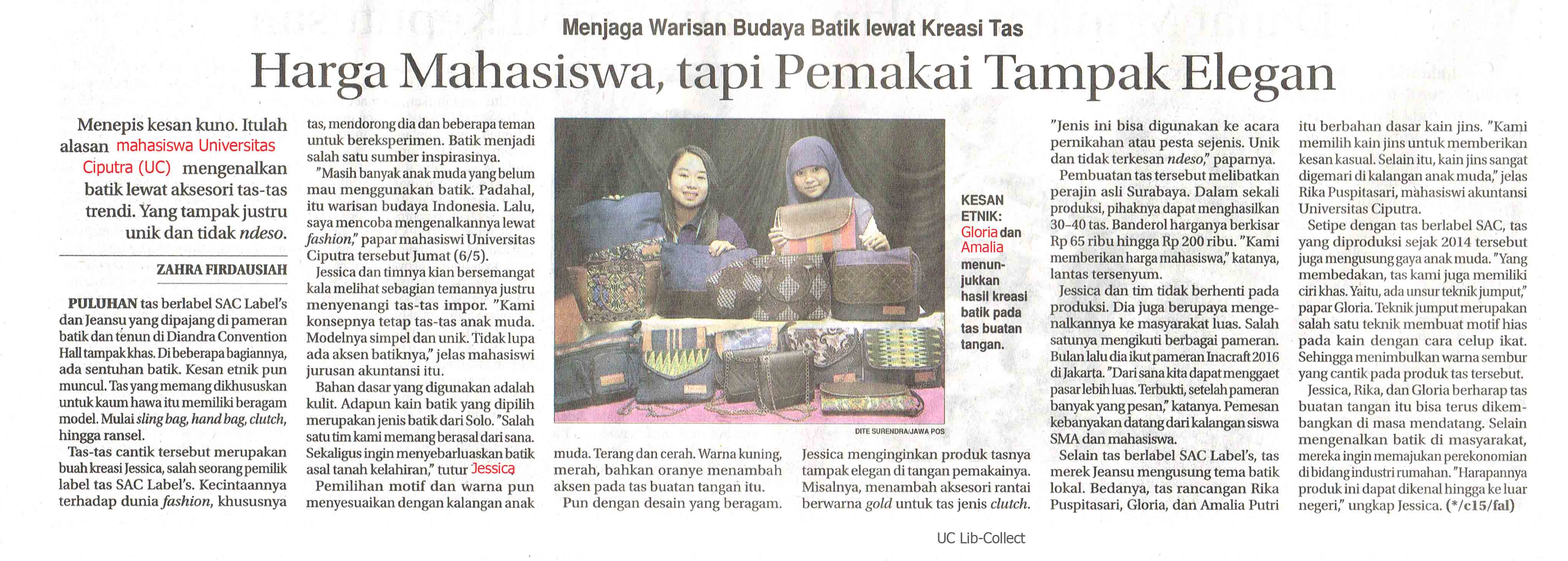 Menjaga Warisan Budaya Batik Lewat Kreasi Tas_Harga Mahasiswa, Tapi Pemakai Tampak Elegan. Jawa Pos. 8 Mei 2016. Hal. 28