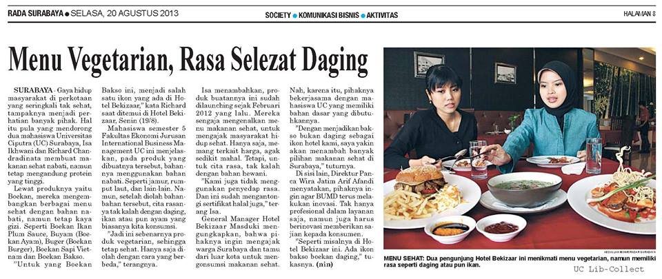 SURABAYA – Gaya hidup masyarakat diperkoataanyang sering kali tak sehat, dampaknya menjadi perhatian banyak pihak. Hal itu pulah yang mendorong dua mahasiswa Universitas Ciputra (UC) Surabaya, Isa ikhawani dan Richard Chandradinata membuat makanan sehat nabati, namun tetap mengandung protein yang tinggi. Lewat produknya yaitu Boekan, mereka mengembangkan berbagai menu sehat dengan bahan nabati, namun tetap kaya gizi. Seperti Boekan Ikan Plum Sauce, Buyam (Boekan Ayam), Buger (Boekan Burger), Boekan sapi Vietnam dan Boekan Bakso.