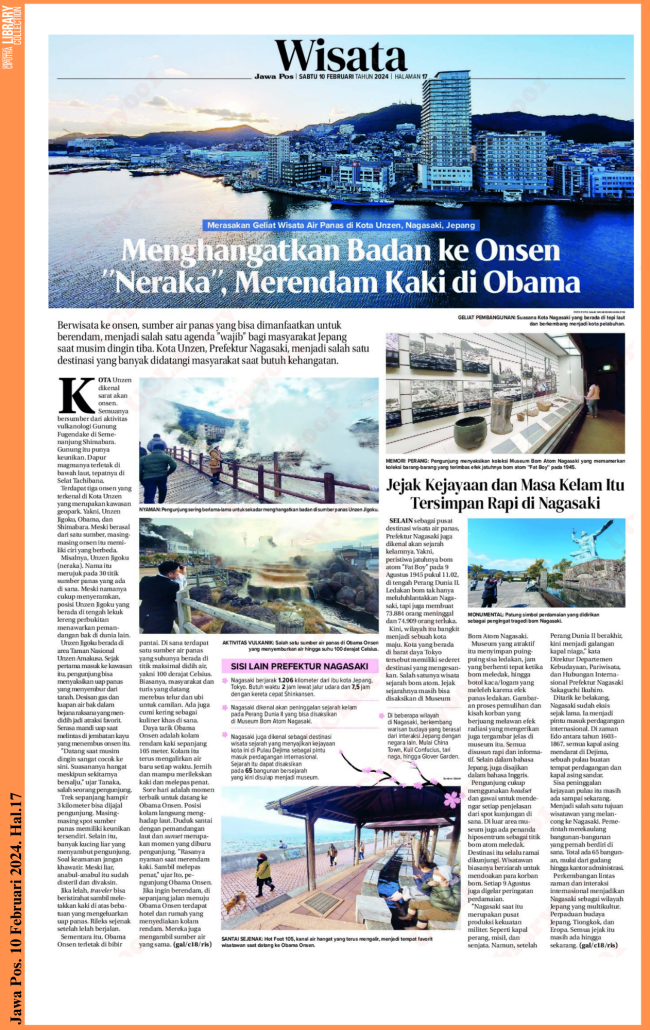 Berwisata ke onsen, sumber air panas yang bisa dimanfaatkan untuk berendam, menjadi salah satu agenda “wajib” bagi masyarakat Jepang saat musim dingin tiba. Kota Unzen, Prefektur Nagasaki, menjadi salah satu destinasi yang banyak didatangi masyarakat saat butuh kehangatan.