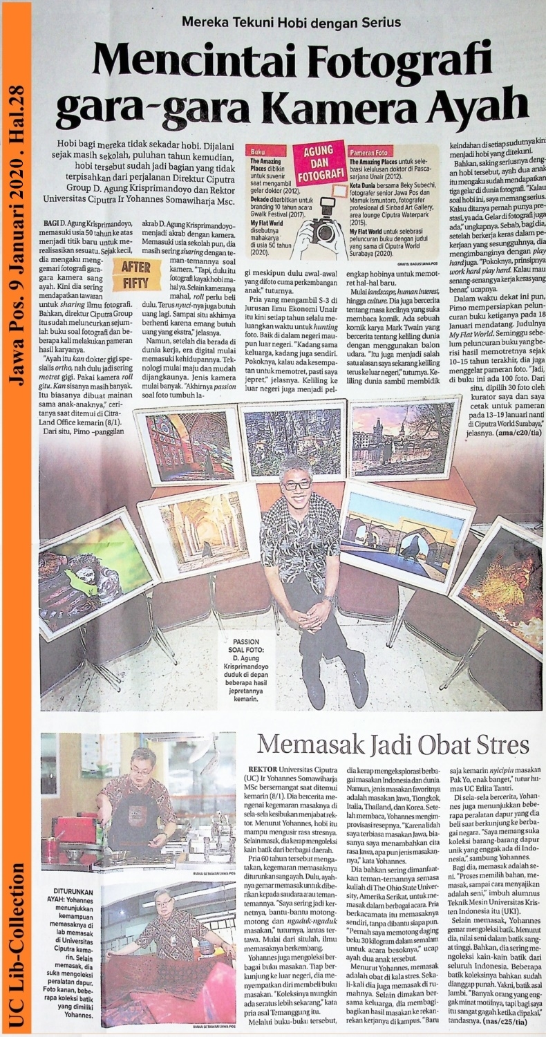 BAGI D. Agung Krisprimandoyo memasuki usia 50 tahun ke atas menjadi titik baru untuk merealisasikan sesuatu. Sejak kecil, dia mengaku menggemari fotografi gara-gara kamera sang ayah. Kini dia sering mendapatkan tawaran untuk sharing ilmu fotografi. Bahkan, direktur Ciputra Group itu sudah meluncurkan sejumlah buku soal fotografi dan beberapa kali melakukan pameran hasil karyanya.