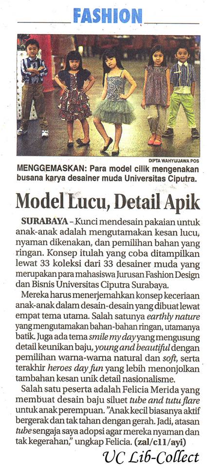 SURABAYA– Kunci mendesain pakaian untuk anak-anak adalah mengutamakan kesan lucu, nyaman di kenakan,dan pemilihan bahan yang ringan. Konsep itulah yang coba di tampilkan lewat 33 koleksi dari 33 desainer muda yang merupakan para mahasiswa Jurusan Fashion Desain dan Bisnis Universitas Ciputra Surabaya.