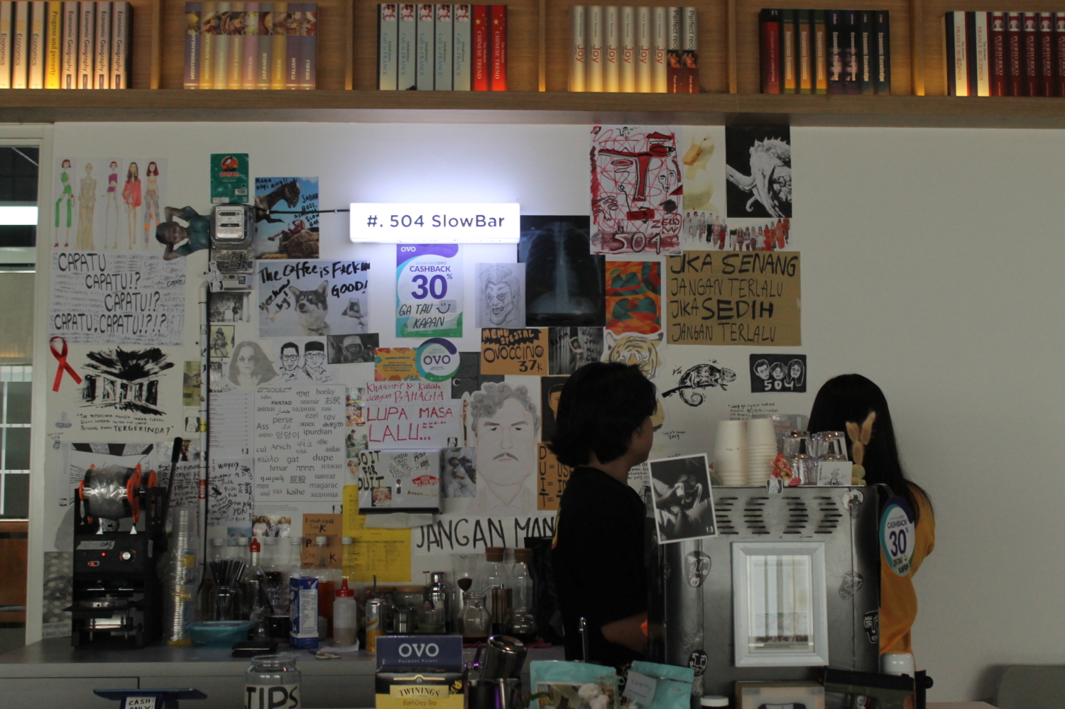 Meski sekarang tampak lancar dan peralatannya lengkap, usaha mereka berawal dari dua teko kopi bekas. Namun, lanjut dia, berbisnis tidak perlu mewah serta menunggu cukup modal. Yang penting, ada keinginan, ada tekad, dan yakin sukses. 504 Slowbar juga sempat masuk liputan Koran Jawa Pos tanggal 18 April 2019 Hal.19