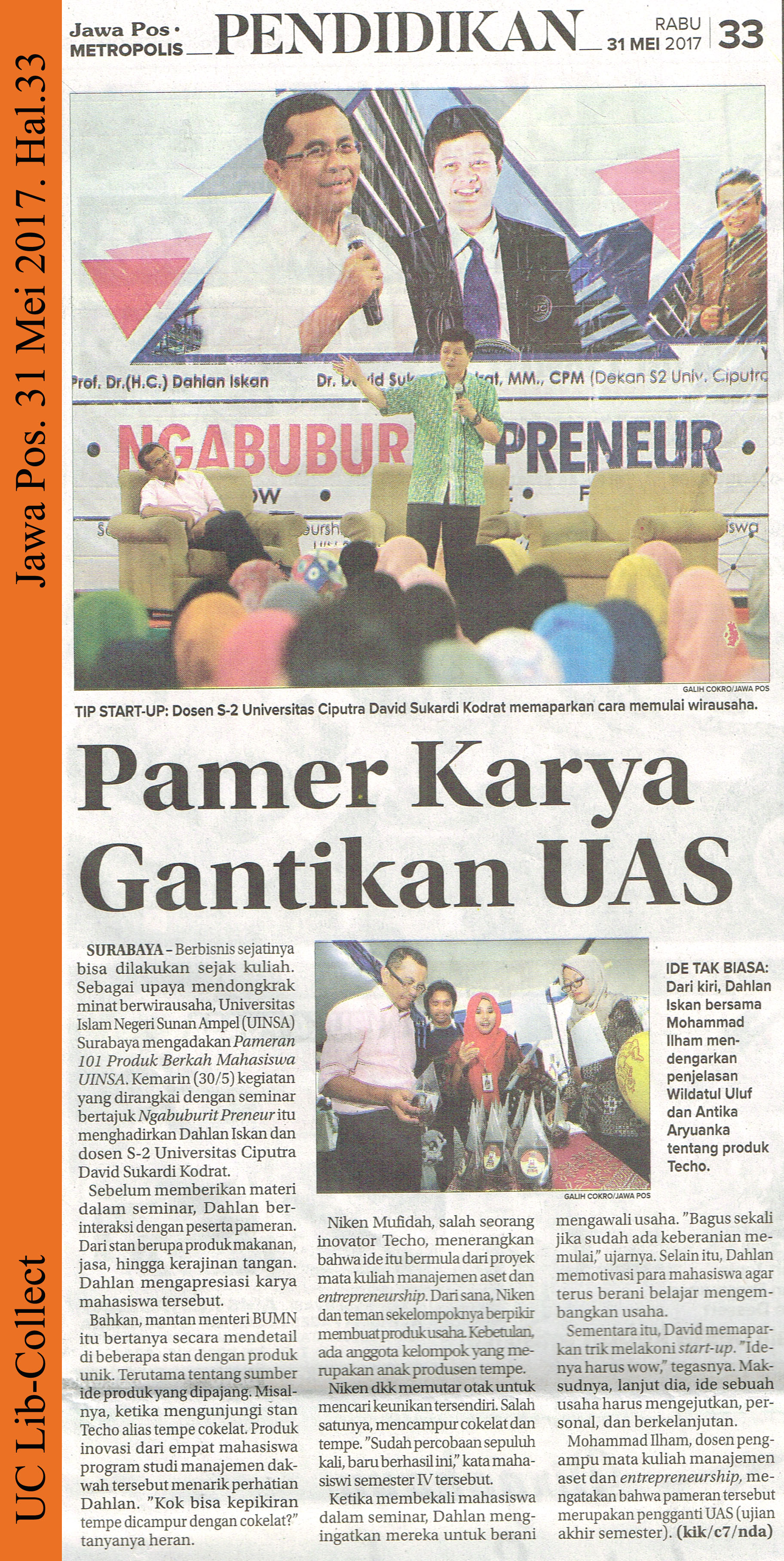 Surabaya – berbisnis sejatinya bisa dilakukan sehak kuliah. Sebagai upaya mendongkrak minat berwirausaha, Universitas Islam Sunan Ampel (UINSA) Surabaya mengadakan Pameran 101 Produk Berkah Mahasiswa UINSA. Kemarin (30/5) kegiatan yang dirangkai dengan seminar bertajuk Ngabuburit Preneur itu menghadirkan Dahlan Iskan dan dosen S-2 Universitas Ciputra David Sukardi Kodrat.