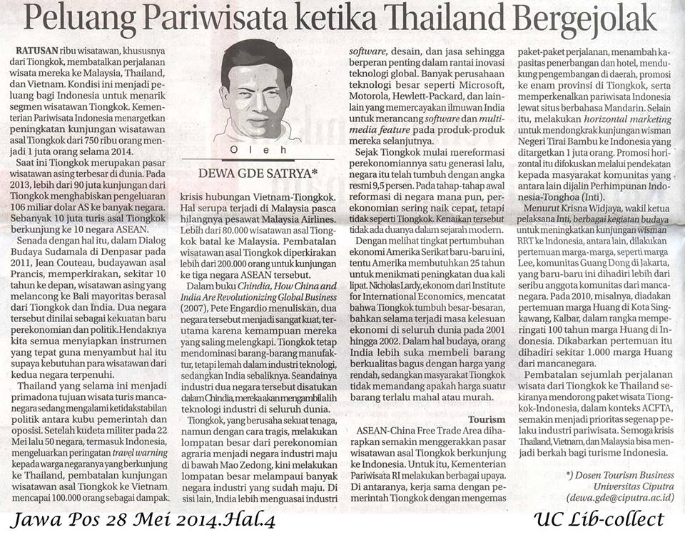 Pembatalan sejumlah perjalanan wisata dari Tiongkok ke Thailand sekiranya mendorong paket wisata Tiongkok-Indonesia, dalam konteks ACFTA, semakin menjadi prioritas segenap pelaku industri pariwisata. Semoga krisis Thailand, Vietnam, dan Malaysia bisa menjadi berkah bagi turisme Indonesia