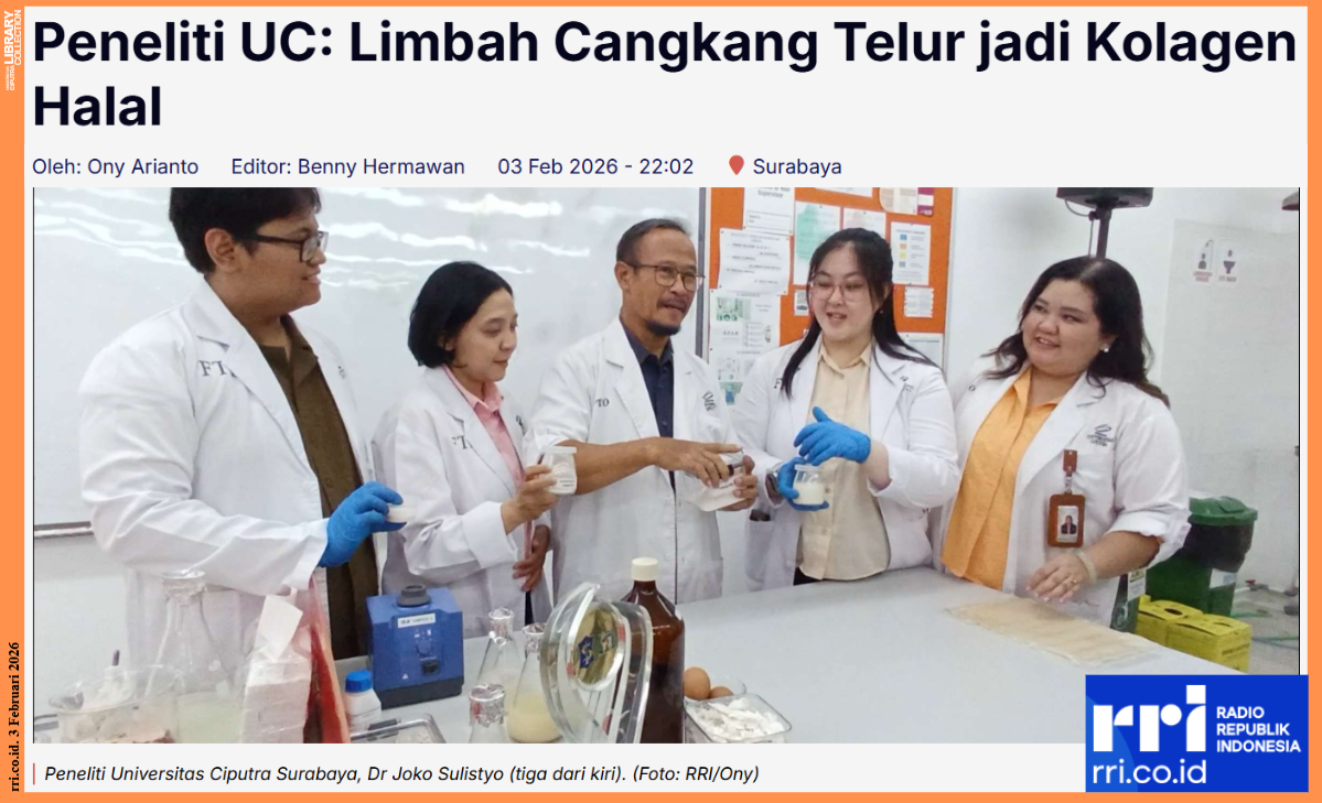 RRI.CO.ID, Surabaya – Limbah cangkang telur yang sering ditemui di lingkungan sekitar ternyata berpotensi diolah menjadi produk bernilai tinggi. Peneliti Universitas Ciputra (UC) Surabaya, Dr Joko Sulistyo mengembangkan riset kolagen halal dari limbah tersebut.
