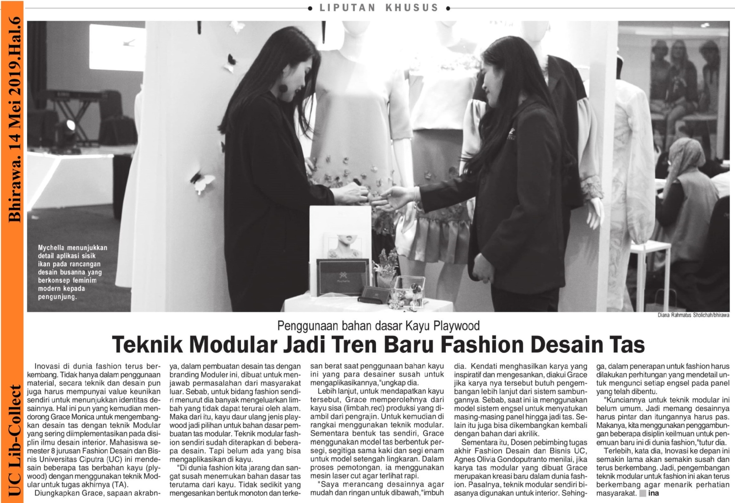 Inovasi di dunia fashion terus berkembang. Tidak hanya dalam penggunaan material, secara teknik dan desain pun juga harus mempunyai value keunikan sendiri untuk menunjukkan identitas desainnya. Hal ini pun yang kemudian mendorong Grace Monica untuk mengembangkan desain tas dengan teknik Modular yang sering diimplementasikan pada disiplin ilmu desain interior. Mahasiswa semester 8 jurusan Fashion Desain dan Bisnis Universitas Ciputra (UC) ini mendesain beberapa tas berbahan kayu (plywood) dengan menggunakan teknik Modular untuk tugas akhirnya (TA).