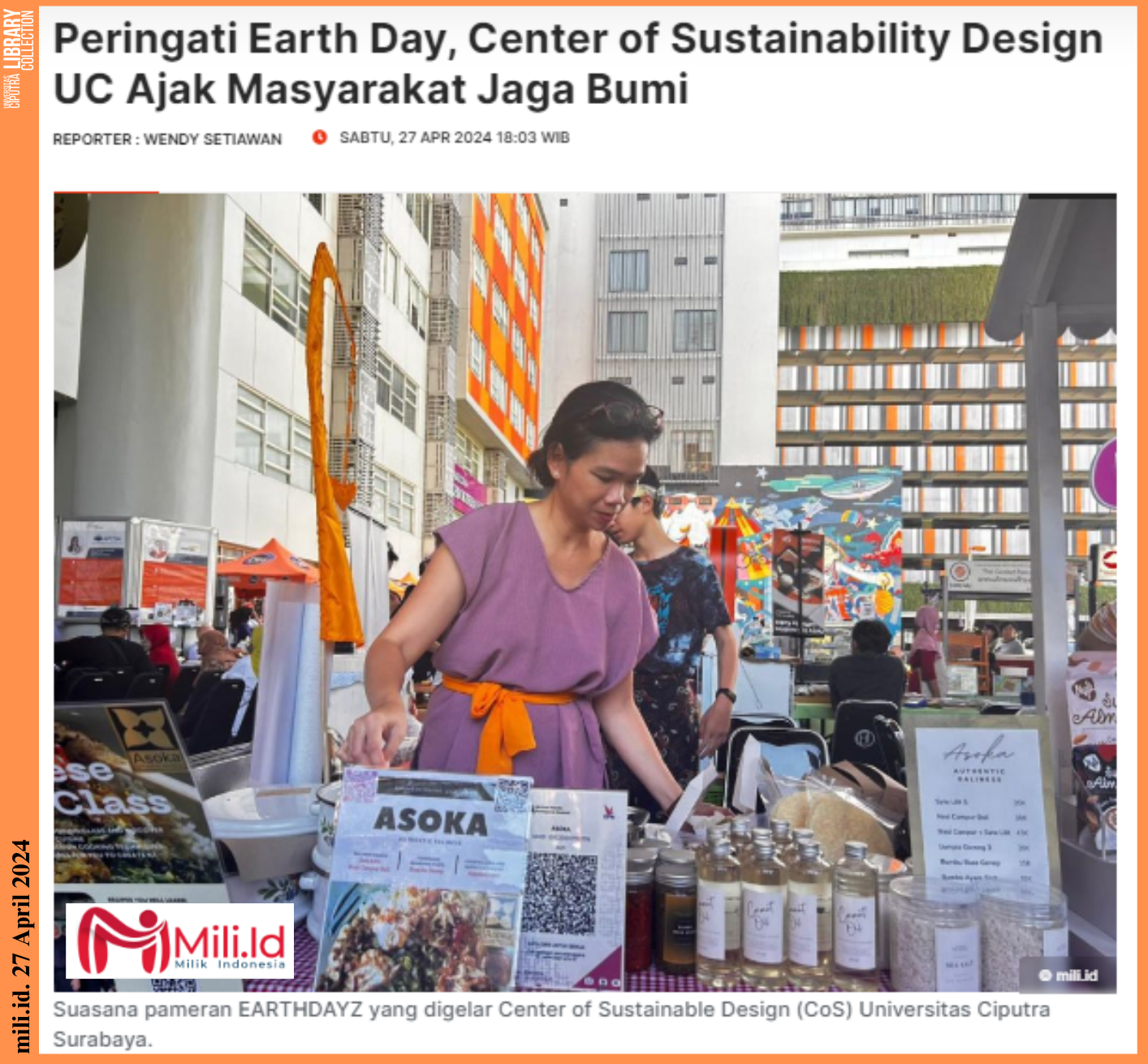 Surabaya – Dalam rangka memperingati Hari Bumi yang jatuh pada 22 April 2024 kemarin, Center of Sustainable Design (CoS) Universitas Ciputra Surabaya menggelar acara perayaan dengan tajuk EARTHDAYZ, Jumat (27/04/2024).
