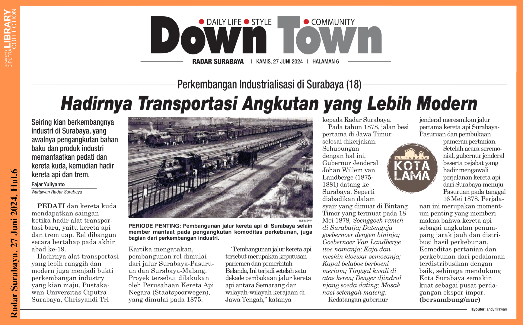 Hadirnya alat transportasi yang lebih canggih dan modern juga menjadi bukti perkembangan industry yang kian maju. Pustakawan Universitas Ciputra Surabaya, Chrisyandi Tri Kartika mengatakan, pembangunan rel dimulai dari jalur Surabaya-Pasuruan dan Surabaya-Malang. Proyek tersebut dilakukan oleh Perusahaan Kereta Api Negara (Stattspoorwegen), yang dimulai pada 1875.