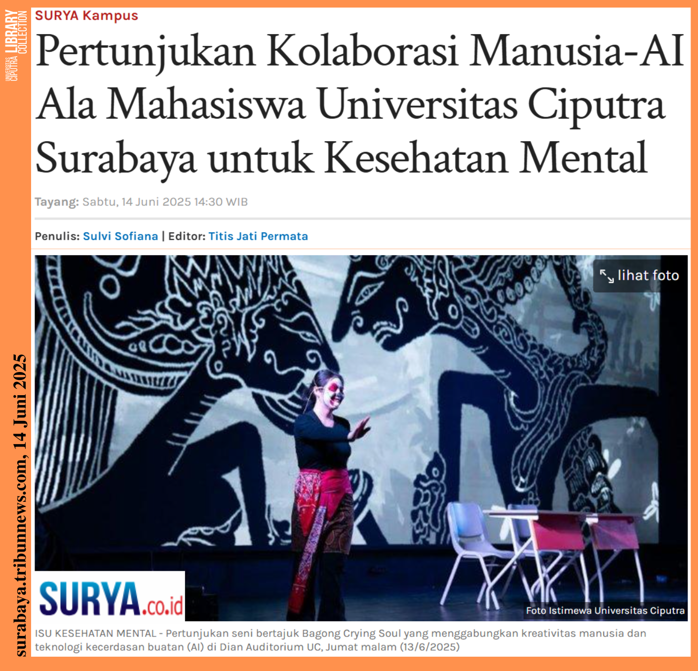 SURYA.CO.ID, SURABAYA – Mahasiswa Universitas Ciputra (UC) Surabaya menggelar pertunjukan seni bertajuk Bagong Crying Soul yang menggabungkan kreativitas manusia dan teknologi kecerdasan buatan (AI) sebagai bentuk kepedulian terhadap isu kesehatan mental di kalangan generasi muda.