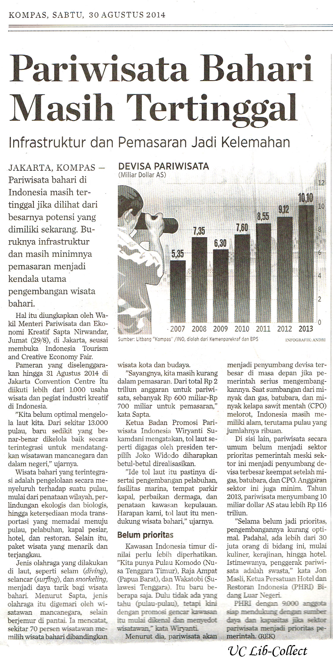 Di sisi lain, paiwisata secara umum belum menjadi sektor prioritas pemerintah meski sektor ini menjadi penyumbang devisa terbesar keempat setelah migas, batubara, dan CPO. Anggaran sektor juga minim. Tahun 2013, pariwisata menymbang 10 miliar dollar AS atau lebih Rp116 triliun.
