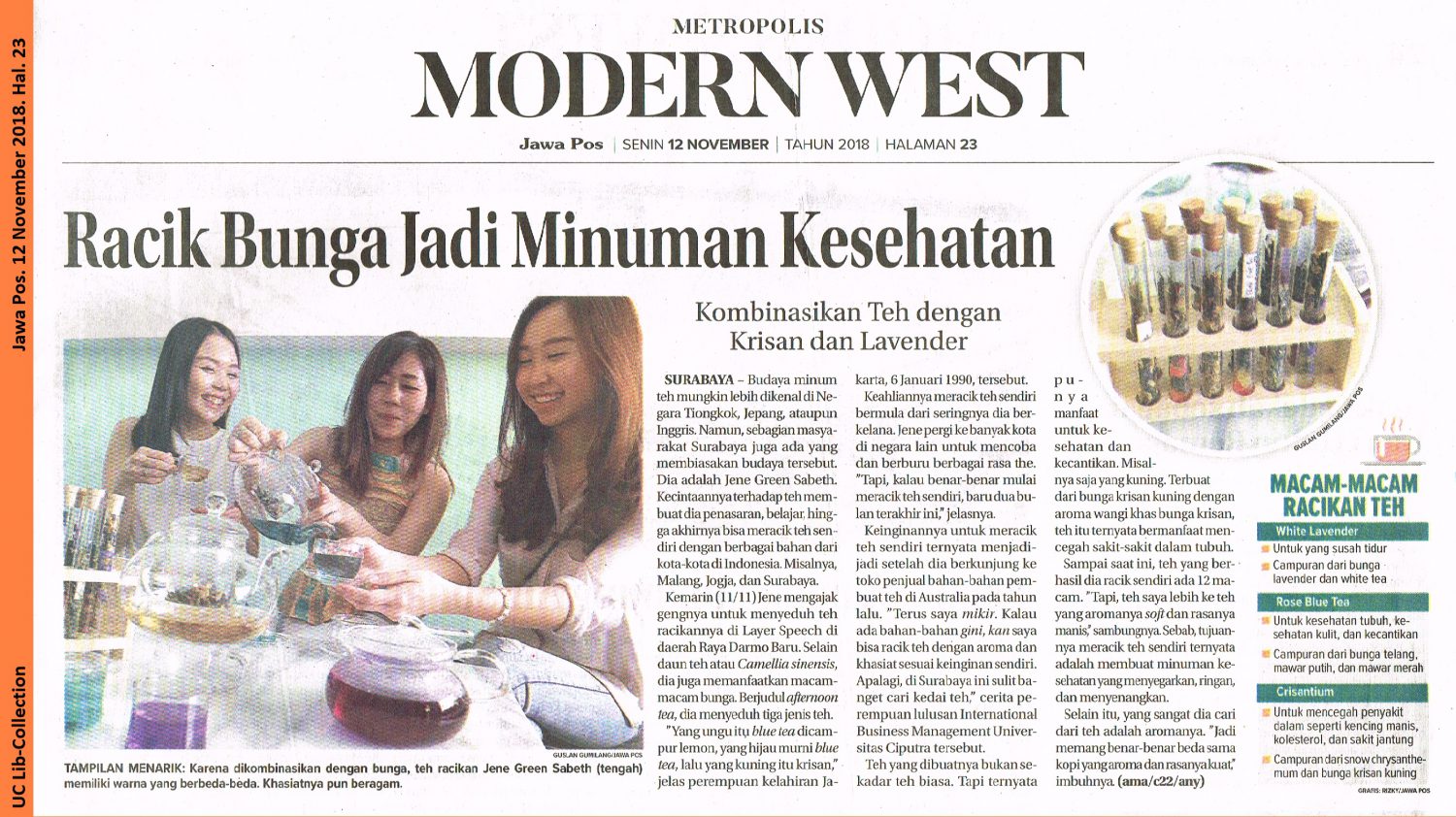 SURABAYA – Budaya minum teh mungkin lebih dikenal di Negara Tiongkok, Jepang, ataupun Inggris. Namun, sebagian masyarakat Surabaya juga ada yang membiasakan budaya tersebut. Dia adalah Jene Green Sabeth. Kecintaannya terhadap teh membuat dia penasaran, belajar hingga akhirnya bisa meracik teh sendiri dengan berbagai bahan dari kota-kota di Indonesia. Misalnya, Malang, Jogja, dan Surabaya.