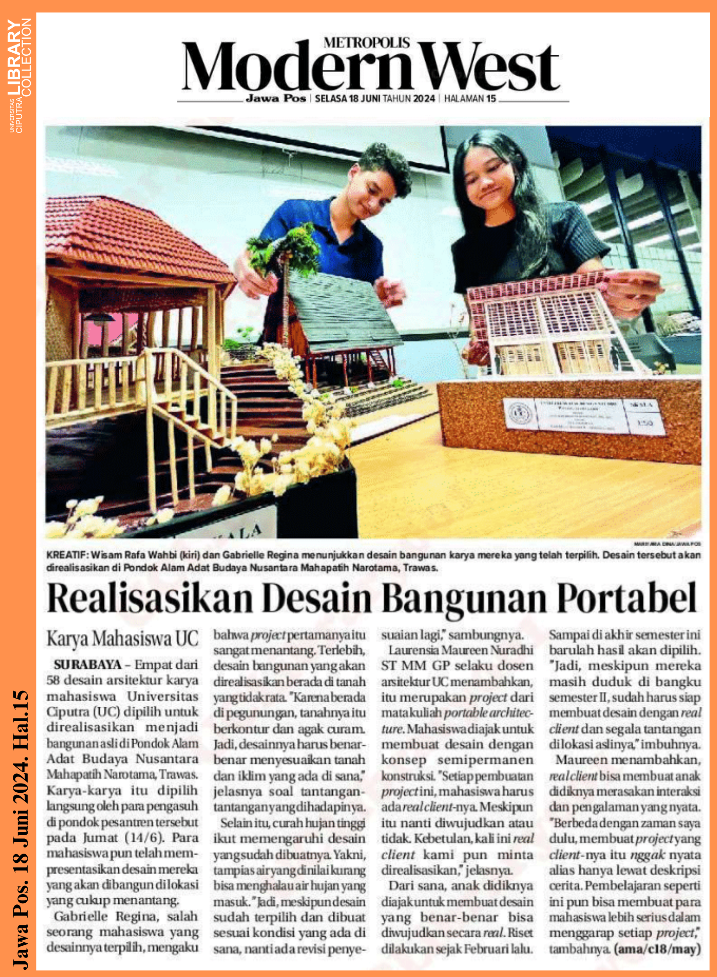 SURABAYA – Empat dari 58 desain arsitektur karya mahasiswa Universitas Ciputra (UC) dipilih untuk direalisasikan menjadi bangunan asli di Pondok Alam Adat Budaya Nusantara Mahapatih Narotama, Trawas. Karya-karya itu dipilih langsung oleh para pengasuh di pondok pesantren tersebut pada Jumat (14/6)/ Para mahasiswa pun telah mempresentasikan desain mereka yang akan dibangun di lokasi yang cukup menantang.