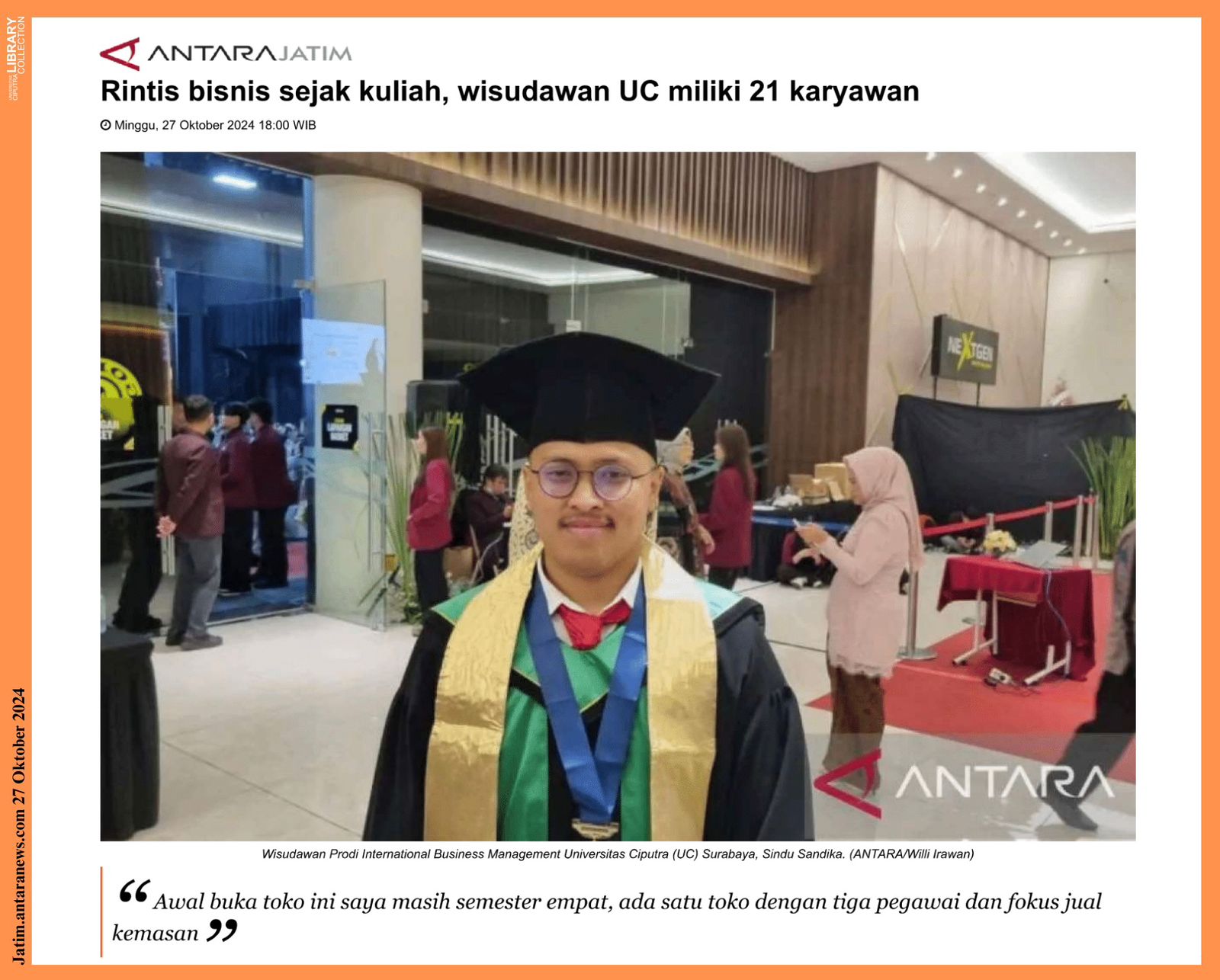Surabaya (ANTARA) – Wisudawan Prodi International Business Management Universitas Ciputra (UC) Surabaya, Sindu Sandika berhasil menjalankan proyek bisnis yang ia rintis dari tugas kuliah di semester dua menjadi bisnis dan memiliki 21 karyawan berasal dari sekitar tempat tinggalnya.