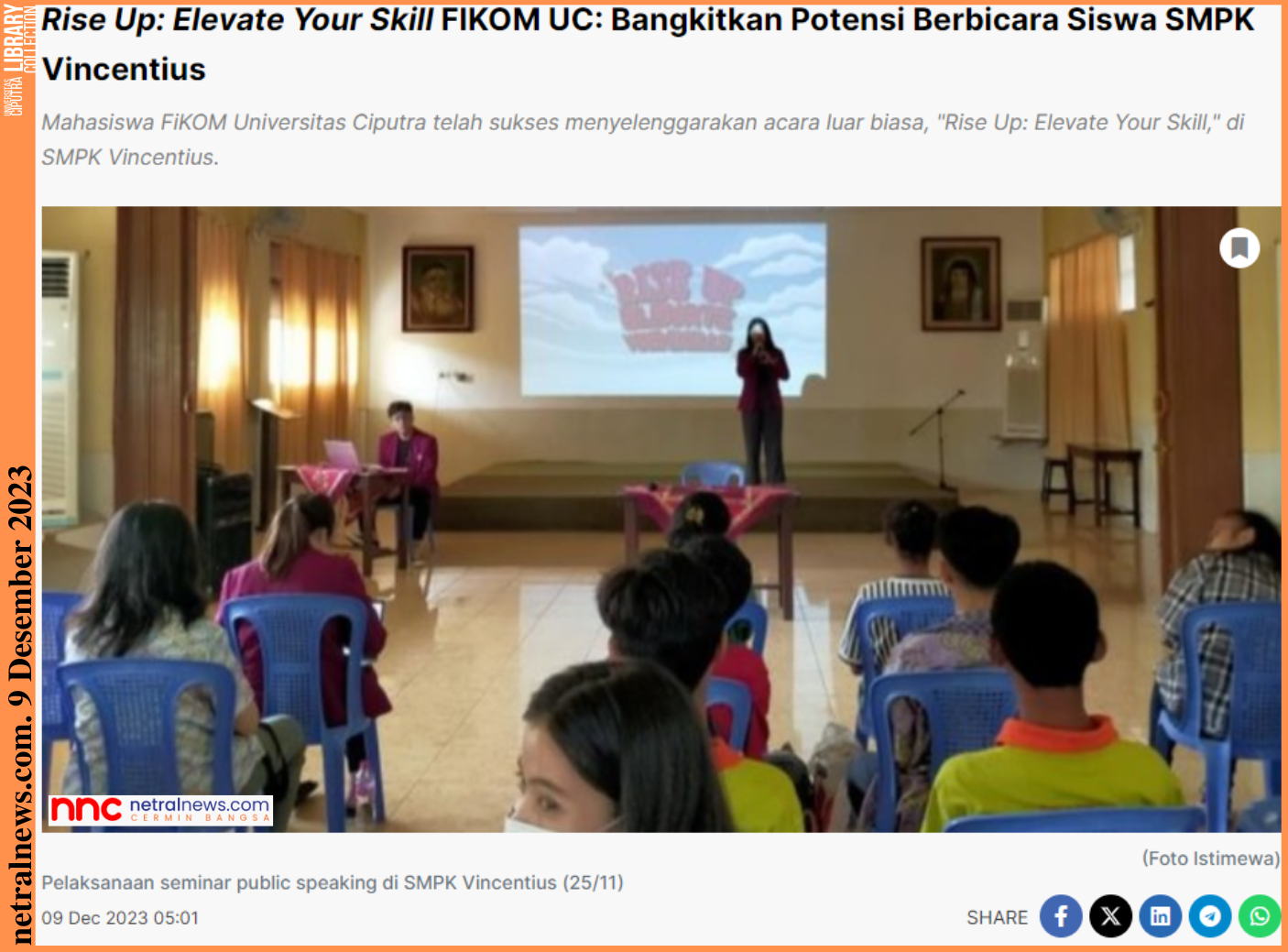 SURABAYA, NETRALNEWS.COM – Mahasiswa FiKOM Universitas Ciputra telah sukses menyelenggarakan acara luar biasa, “Rise Up: Elevate Your Skill,” di SMPK Vincentius, bertujuan untuk membantu siswa-siswi mengembangkan keterampilan public speaking mereka.