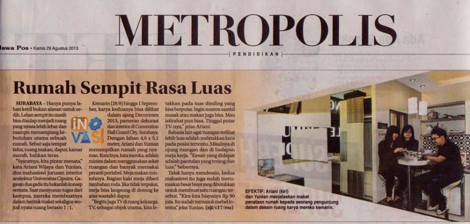 “Syaratnya, kita pintar menata,” kata Arianji Wijaya dan Yunian, dua mahasiswajurusan interior Arsitektur Universitas Ciputra. Gagasan dua gadis itu bukanlah konsep semata. Saat menyusun tugas dari kampus, mereka membuatnya dalam bentuk maket sekaligus wujud nyata ruang berasio 1:1. Kemarin (28/8) hingga 1 september, karya keduanya bisa dilihat dalam ajang decorintex 2013, pameran dekorasi dan inerior di Convention Hall Grand City, Surabaya, dengan lahan 4,6 * 5,1 meter, Ariani dan Yunian menampilkan rumah yang nyaman. Kuncinya kata mereka, adalah minim dalam menggunakan sekat ruangan dan banyak memakai perantai portabel. Mrja makan contohnya. Bangian kaki meja diberi tambahan roda, jika tidak terpakai, meja bisa langsung didorong ke atas wastafel dapur.