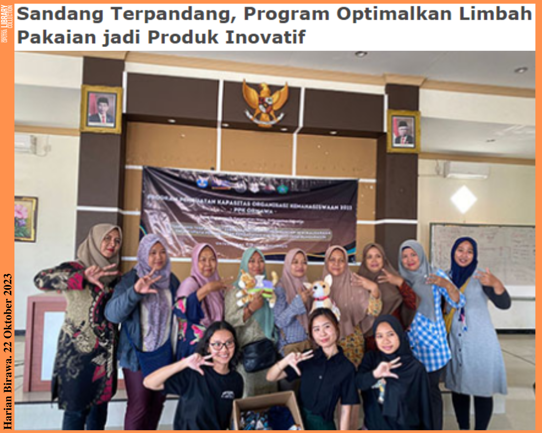 Lima belas mahasiswa ilmu komunikasi dan fashion product design jalankan program Sandang Terpandang. Program ini menyasar ibu-ibu penjahit warga Desa Bungurasih, Waru Sidoarjo. Fokusnya, melatih para penjahit dalam pemanfaatan limbah pakaian untuk diubah menjadi produk inovatif.
