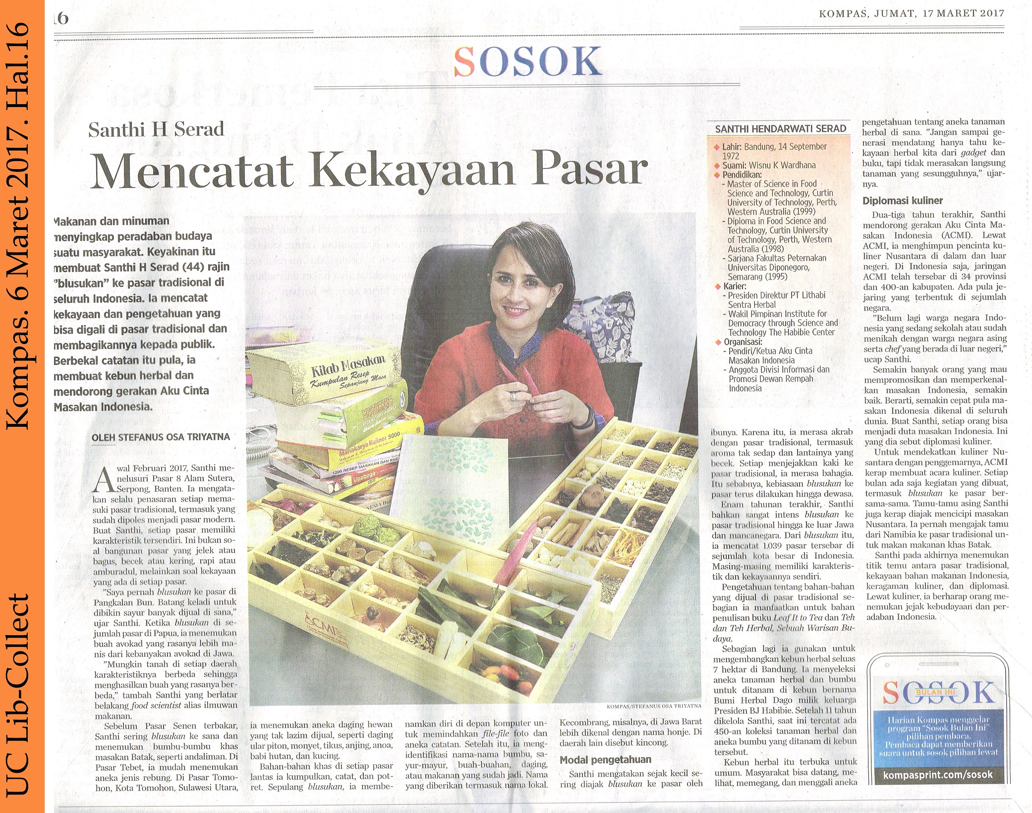 Makanan dan minuman menyingkap peradaban budaya suatu masyarakat. Keyakinan itu membuat Santhi H Serad (44) rajin “blusukan” ke pasar tradisional di seluruh Indonesia.ia mencatat kekayaan dan pengetahuan yang bisa digali di pasar tradisional dan membagikannya kepada publik. Berbekal catatan itu pula, ia membuat kebun herbal dan mendorong gerakan Aku Cinta Masakan Indonesia. OLEH STEFANUS OSA TRIYATNA