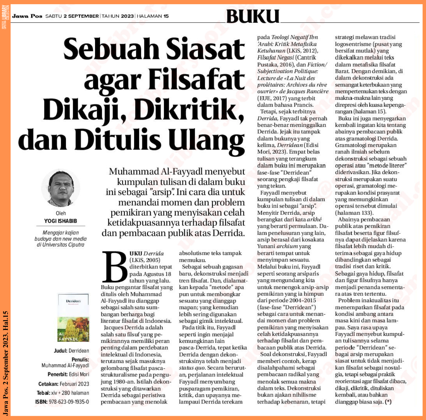 Problem inaktualitas itu menempatkan filsafat pada kondisi ambang antara masa kini dan masa lampau. Saya rasa upaya Fayyadl menyebut kumpulan tulisannya selama periode “Derridean” sebagai arsip merupakan siasat untuk tidak menjadikan filsafat sebagai nostalgia, tetapi sebagai praktik reorientasi agar filsafat dibaca, dikaji, dikritik, dituliskan kembali, atau bahkan dianggap biasa saja. (*)