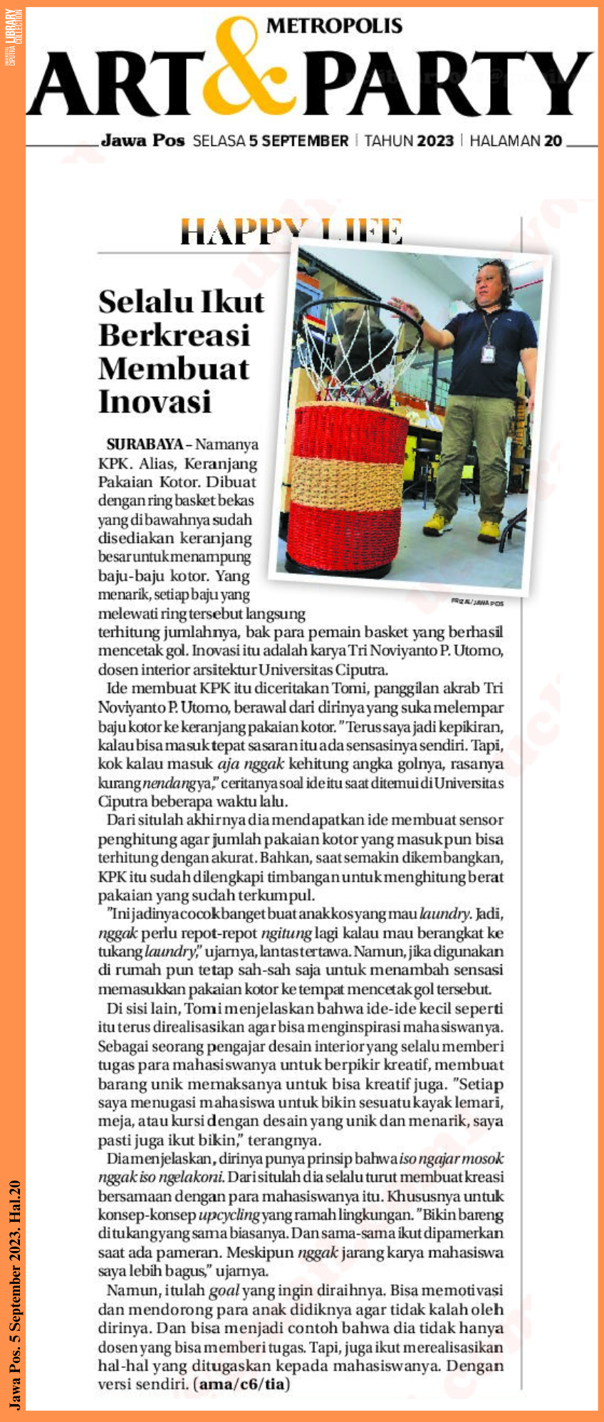 SURABAYA-Namanya KPK. Alias, Keranjang Pakaian Kotor. Dibuat dengan ring basket bekas yang dibawahnya sudah disediakan keranjang besar untuk merampung baju-baju kotor. Yang menarik, setiap baju yang melewati ring tersebut langsung terhitung jumlahnya, bak para pemain basket yang berhasil mencetak gol. Inovasi itu adalah karya Tri Noviyanto P.Utomo, dosen interior arsitektur Universitas Ciputra.
