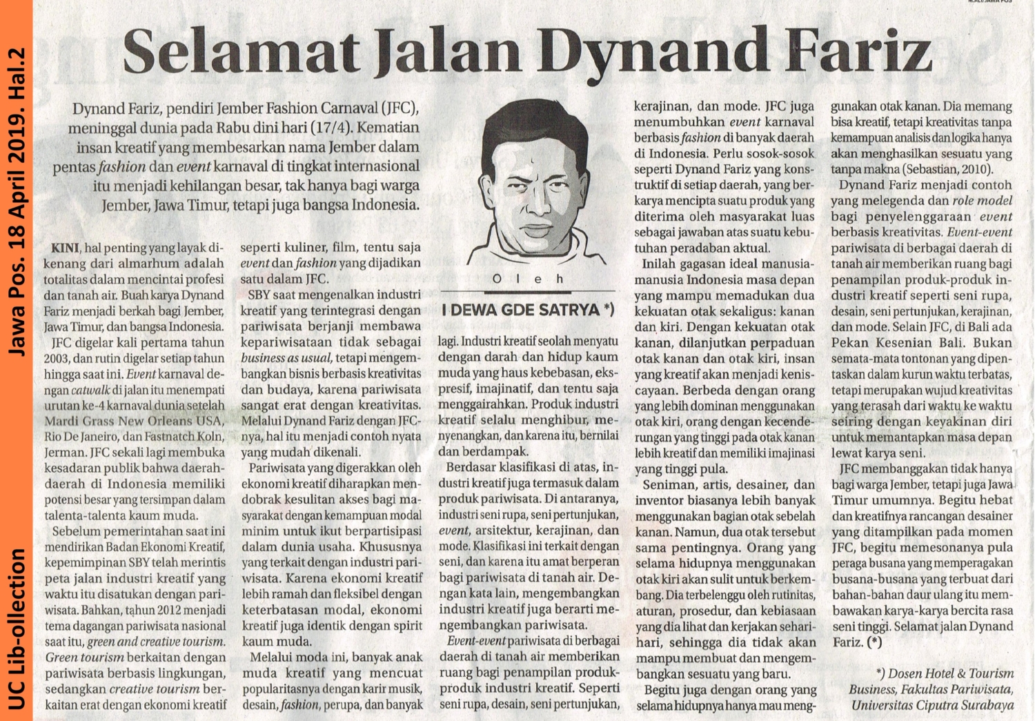 Dynand Fariz, pendiri Jember Fashion Carnaval (JFC), meninggal dunia pada Rabu dini hari (17/4). Kematian insan kreatif yang membesarkan nama Jember dalam pentas fashion dan event karnaval di tingkat Internasional ini menjadi kehilangan besar, tak hanya bagi warga Jember, Jawa Timur, tetapi juga bangsa Indonesia.