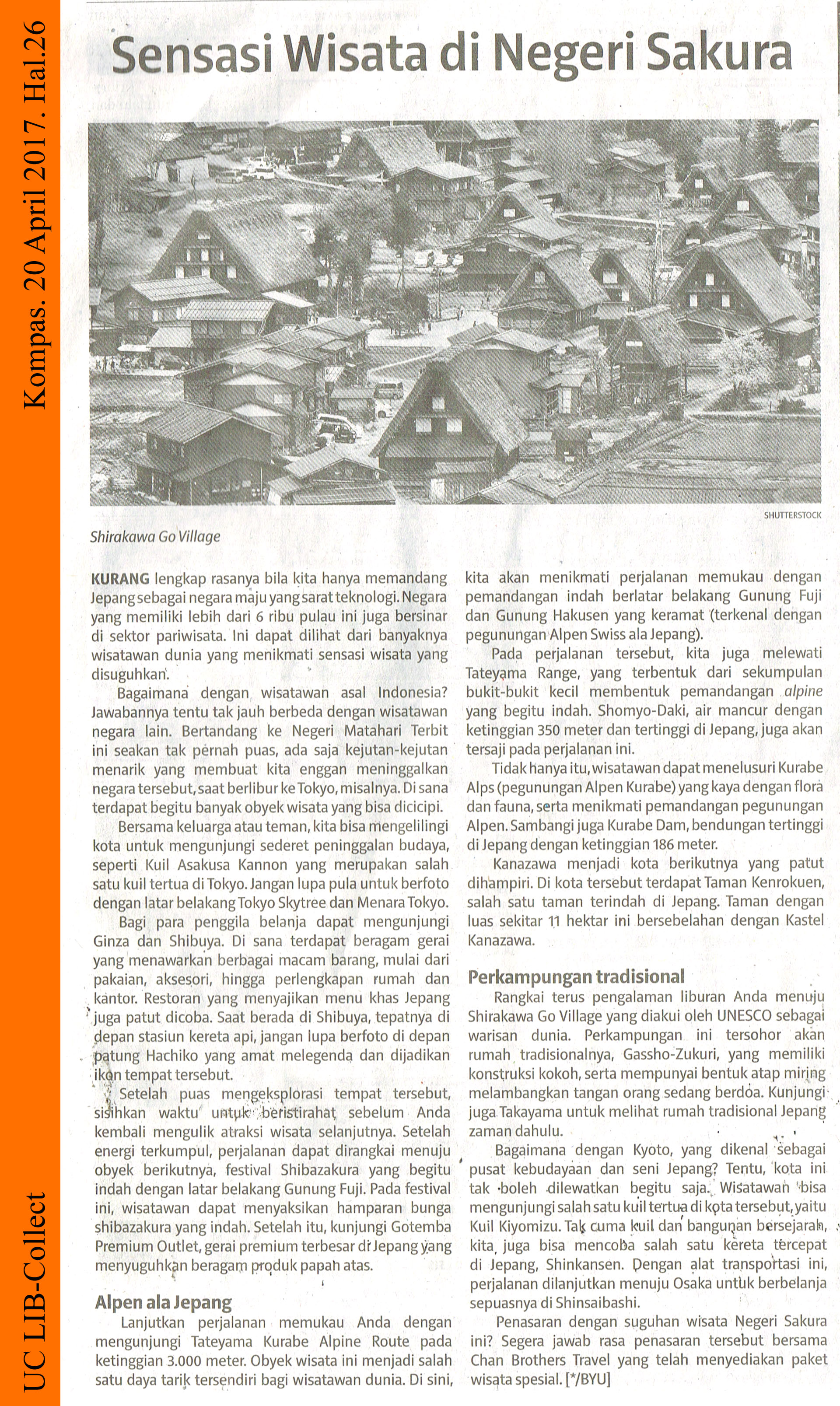 Sensasi Wisata di Negeri Sakura. Kompas. 20 April 2017. Hal.26
