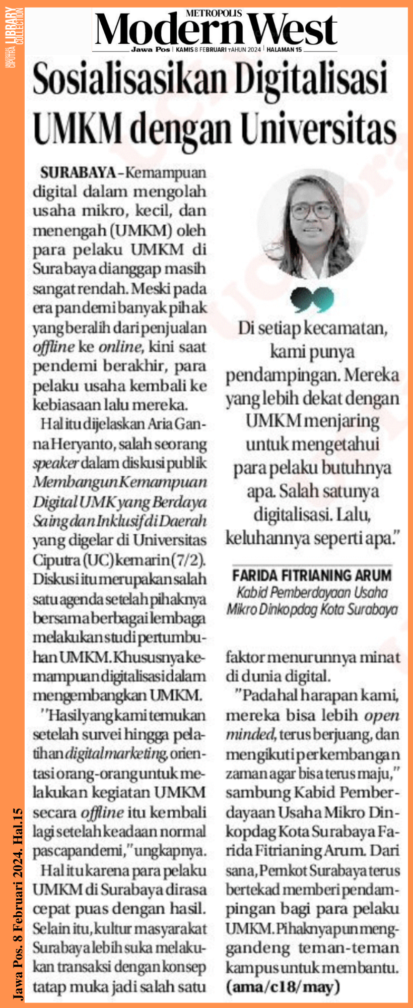 Hal itu dijelaskan Aria Ganna Heryanto, salah seorang speaker dalam diskusi publik Membangun Kemampuan Digital UMK yang Berdaya Saing dan Inklusif di Daerah yang digelar di Universitas Ciputra (UC) kemarin (7/2). Diskusi itu merupakan salah satu agenda setelah pihaknya bersama berbagai lembaga melakukan studi pertumbuhan UMKM. Khususnya kemampuan digitalisasi dalam mengembangkan UMKM.