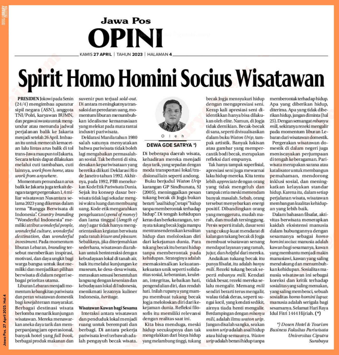 Dalam bahasan filsafat, aktivitas berwisata menerapkan kaidah eksistensi manusia dalam hubungannya dengan sesamanya sebagai homo homini socius: manusia adalah kawan bagi sesamanya, kawan yang membantu menjadi makin manusiawi, kawan yang saling mendukung dan menumbuhkan kehidupan.Sosialitas manusia wisatawan ini sebagai koreksi dan krtik terhadap sosialitas yang saling memakan, yang saling membenci, sebuah sosialitas homo horini lupus: manusia adalah serigala bagi sesamanya.Selamat Hari Raya Idul Fitri 1444 Hijriah.(“)