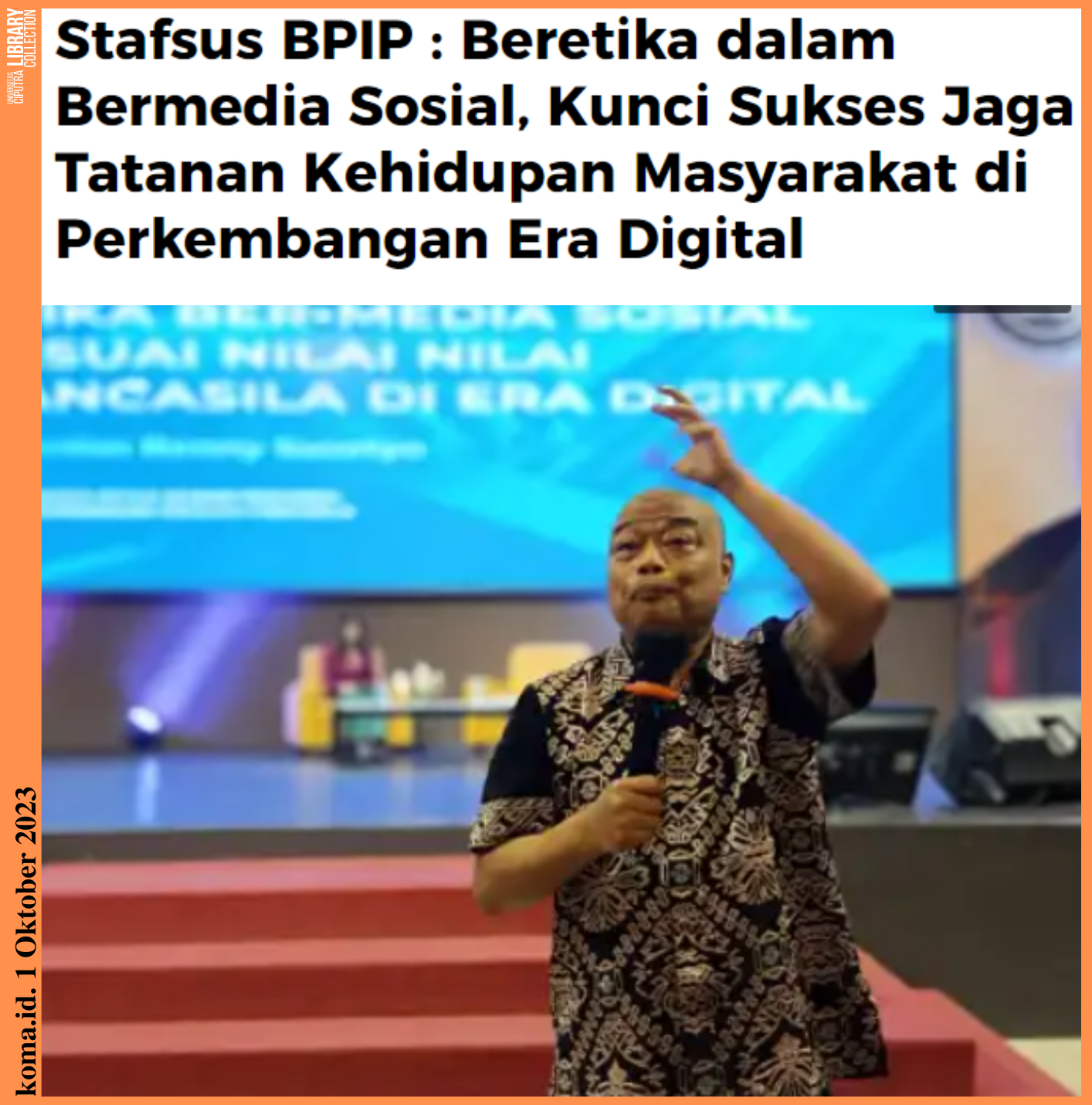 Klik berita: https://koma.id/2023/10/01/stafsus-bpip-beretika-dalam-bermedia-sosial-kunci-sukses-jaga-tatanan-kehidupan-masyarakat-di-perkembangan-era-digital/