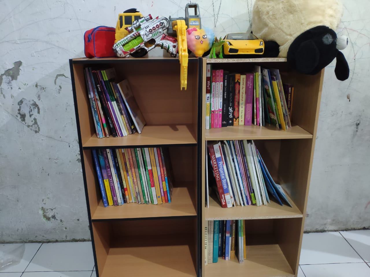 Buku-buku hasil sumbangan yang sudah dipajang di rak di Panti Asuhan Ulul Albab Surabaya