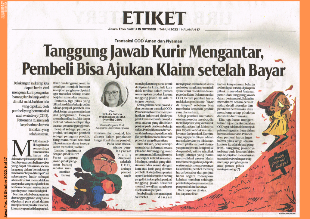 MARI kita menilik bagaimana semestinya dimensi etika harus ada dalam menjalankan praktik COD. Pembayaran pembelian onlin yang dapat dilakukan secara langsung dalam bentuk uang tunai atau ‘bayar di tempat’ ini sebenarnya hadir sebagai alternatif untuk memudahkan masyarakat yang mungkin memudahkan masyarakat yang mungkin belum terbiasa dengan mekanisme pembayaran transaksi digital.