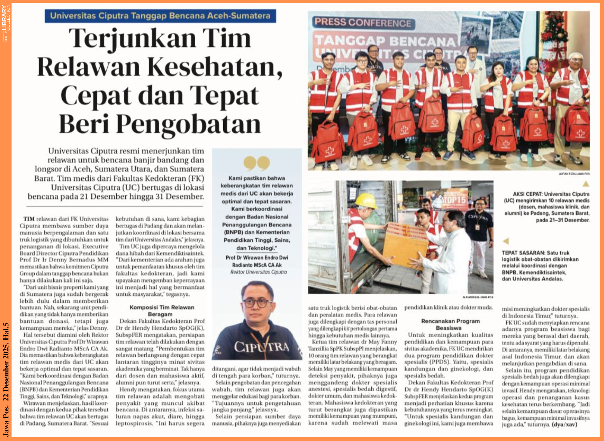 Universitas Ciputra resmi menerjunkan tim relawan untuk bencana banjir bandang dan longsor di Aceh, Sumatera Utara, dan Sumatera barat. Tim medis dari Fakultas Kedokteran (FK) Universitas Ciputra (UC) bertugas di lokasi bencana pada 21 Desember hingga 31 Desember.