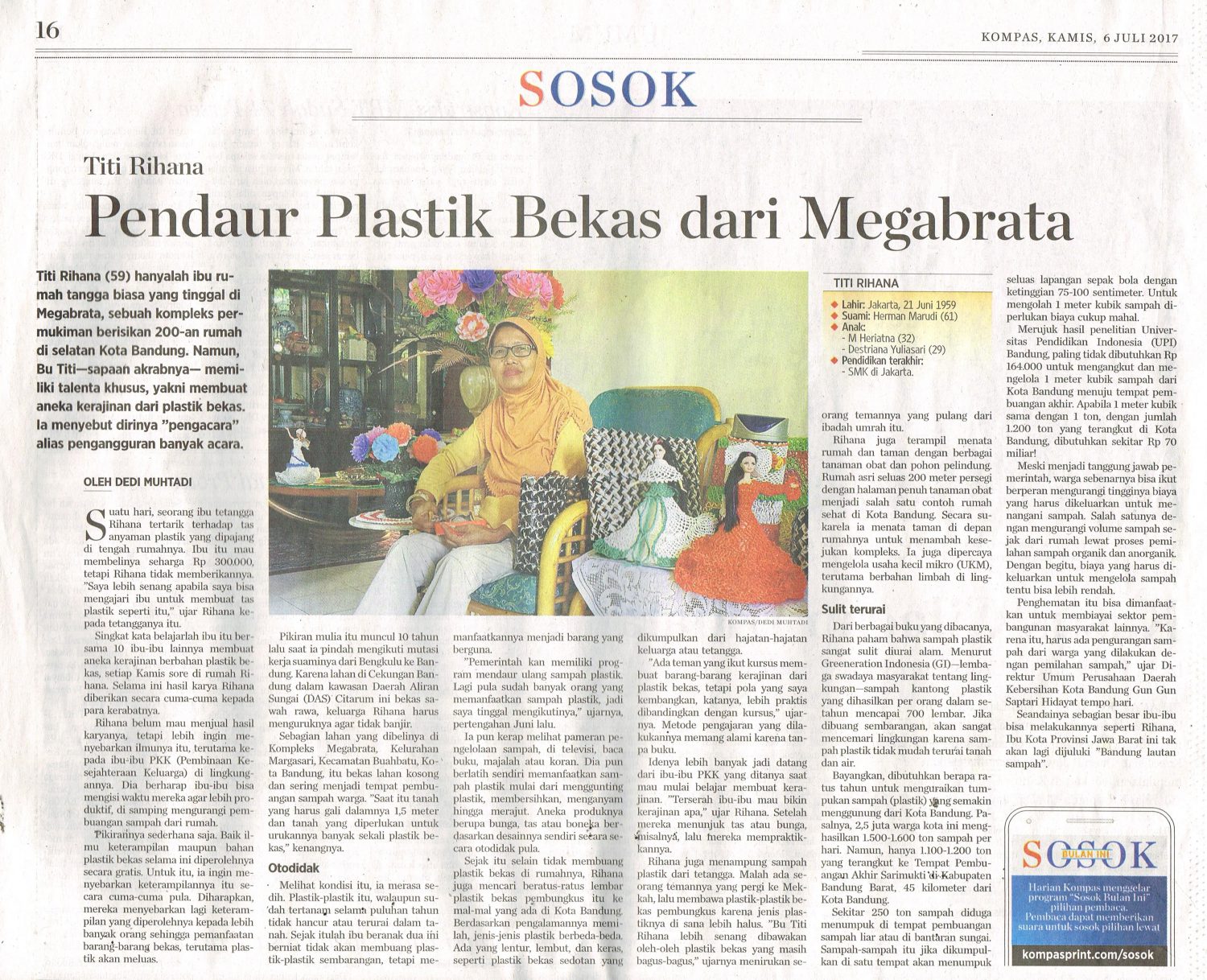 Titi rihana (59) hanyalah ibu rumah tangga biasa yang tinggal di megabrata, sebuah kompleks permukiman berisikan 200-an rumah diselatan kota bandung. Namun, bu titi –sapaan akrabnya- memiliki talenta khusus, yakni membuat aneka kerajinan dari plastik bekas. Ia menyebut dirinya “pengacara” alias pengangguran banyak acara.