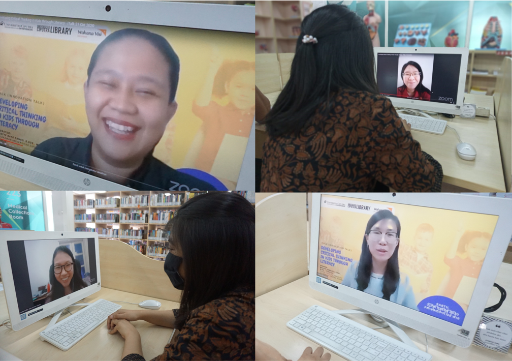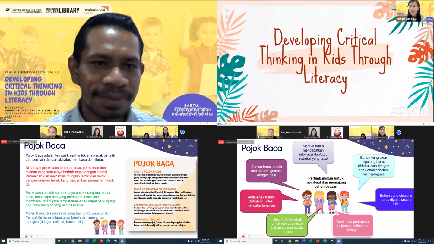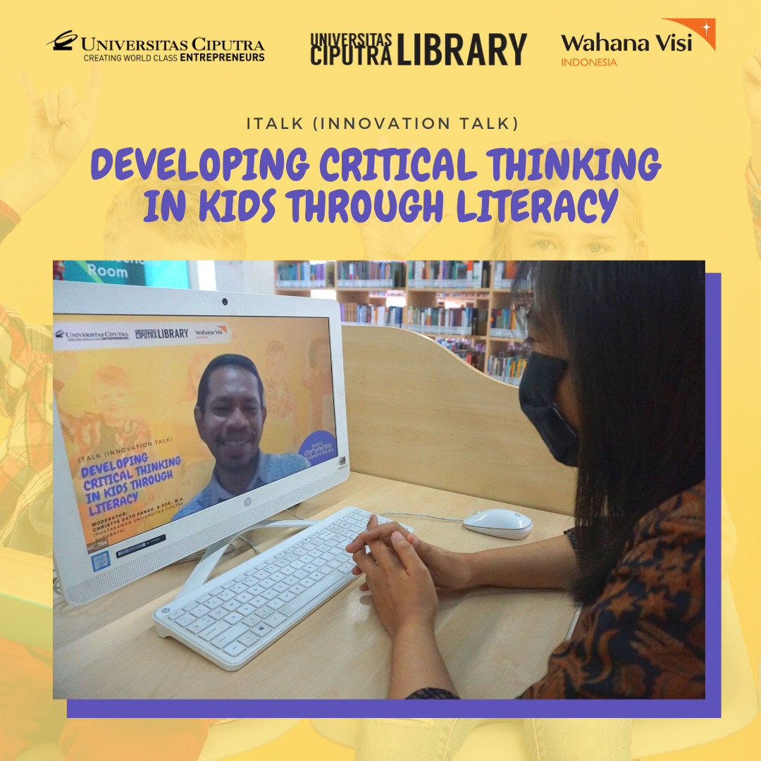 Perpustakaan Universitas Ciputra Surabaya bekerjasama dengan Wahana Visi Indonesia dan Fakultas Psikologi Universitas Ciputra Surabaya menghadirkan iTalk (Innovation Talk) yang bertemakan “Developing Critical Thinking in Kids Through Literacy” yang diselenggarakan pada Sabtu (31/10) lalu. Kegiatan ini dimulai pukul 09.00 WIB ini dihadiri oleh 40 peserta. Kegiatan ini diharapkan memberikan wawasan yang dapat diterapkan oleh orang dewasa seperti orang tua dan pendidik yang sedang mengalami kesulitan dalam meningkatkan daya kritis anak melalui literasi. Kegiatan ini dimoderatori oleh Pak Christye Dato Pango, S.Sos., M.A. (Pustakawan Universitas Ciputra Surabaya) dan mengundang Ibu Melliana Layuk (Spesialis Pendidikan Wahana Visi Indonesia Zonal Jawa, Sumatera dan Kalimantan Barat) dan Ibu Meilani Sandjaja, S.Psi., M.Psi., Psikolog (Dosen Fakultas Psikologi Universitas Ciputra Surabaya)