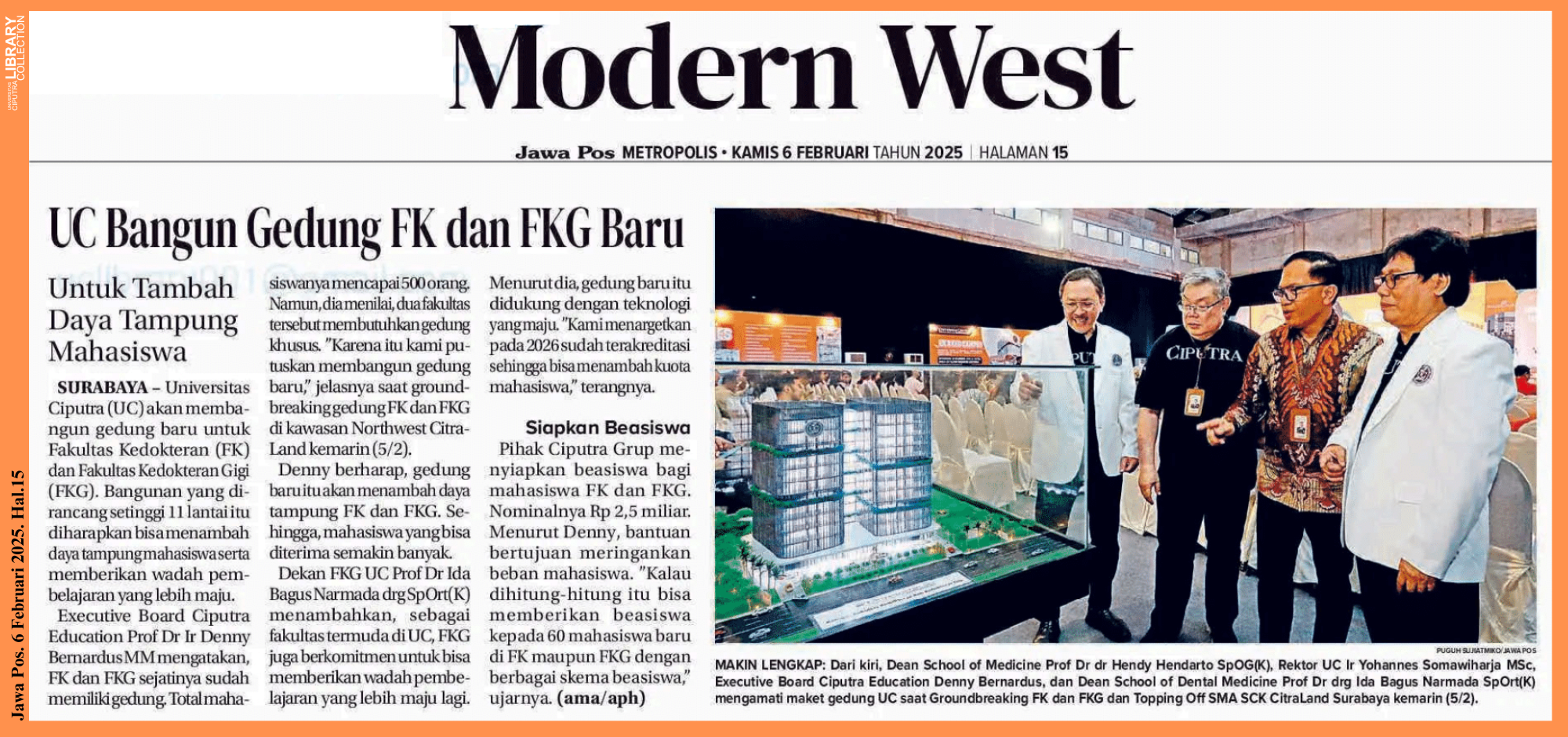SURABAYA – Universitas Ciputra (UC) akan membangun gedung baru untuk Fakultas Kedokteran (FK) dan Fakultas Kedokteran Gigi (FKG). Bangunan yang dirancang setinggi 11 lantai itu diharapkan bisa menambah daya tampung mahasiswa serta memberikan wadah pembelajaran yang lebih maju.