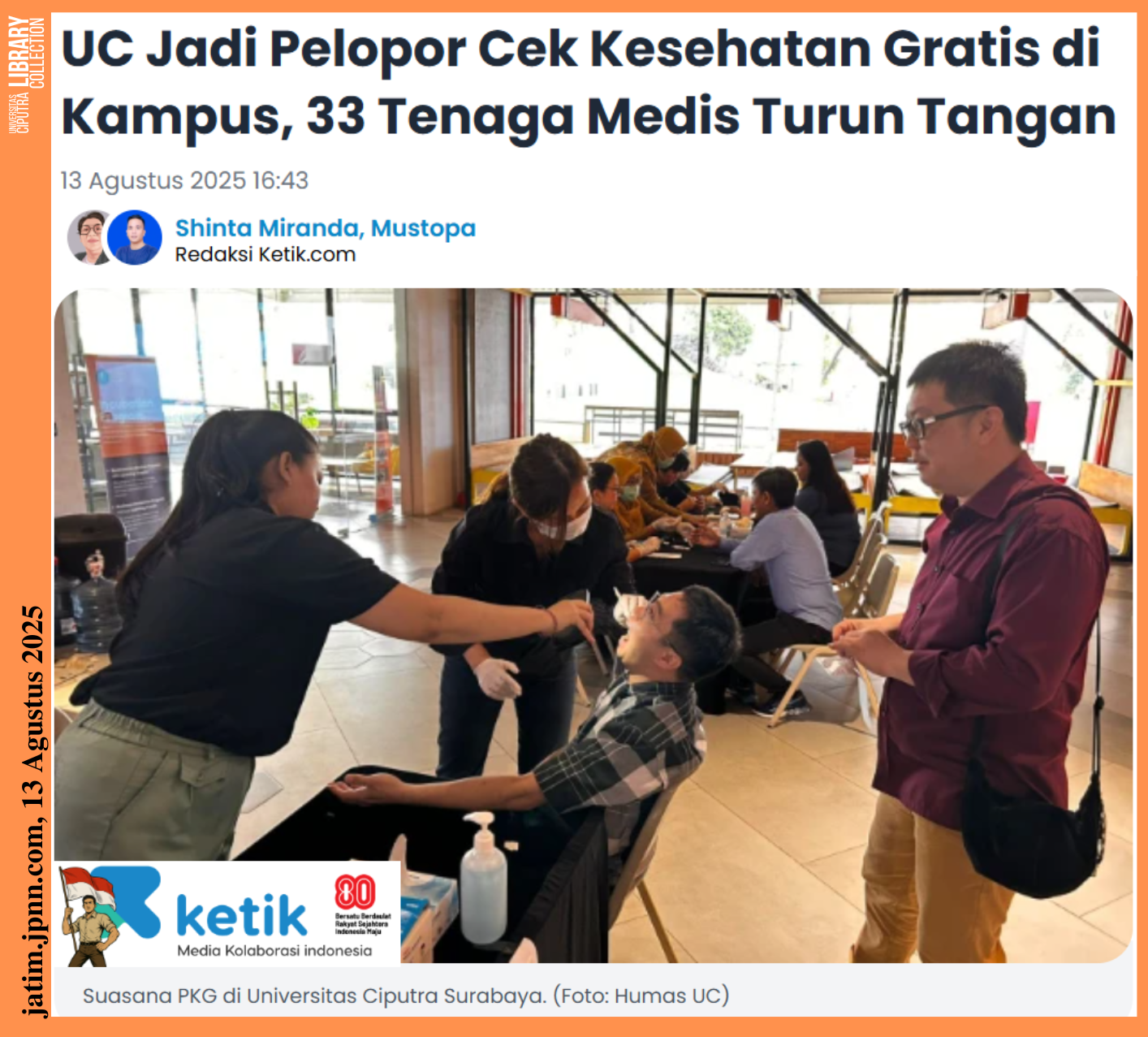 KETIK, SURABAYA – Universitas Ciputra (UC) mencatat sejarah sebagai kampus pertama yang menggelar program Pemeriksaan Kesehatan Gratis (PKG) bagi civitas akademika dan masyarakat umum.