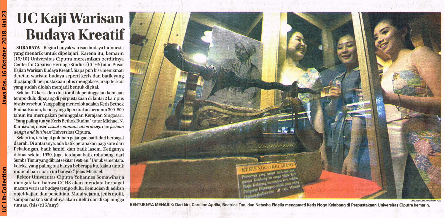 SURABAYA – Begitu banyak warisan budaya Indonesia yang menarik untuk dipelajari. Karena itu, kemarin (15/10) Universitas Ciputra meresmikan berdirinya Center for Creative Haritage Studies (CCHS) atau Pusat Kajian Warisan Budaya Kreatif. Siapa pun bisa menikmati deretan warisan budaya seperti keris dan batik yang dipajang di perpustakaan plus mengakses arsip terkait yang sudah diolah menjadi bentuk digital.