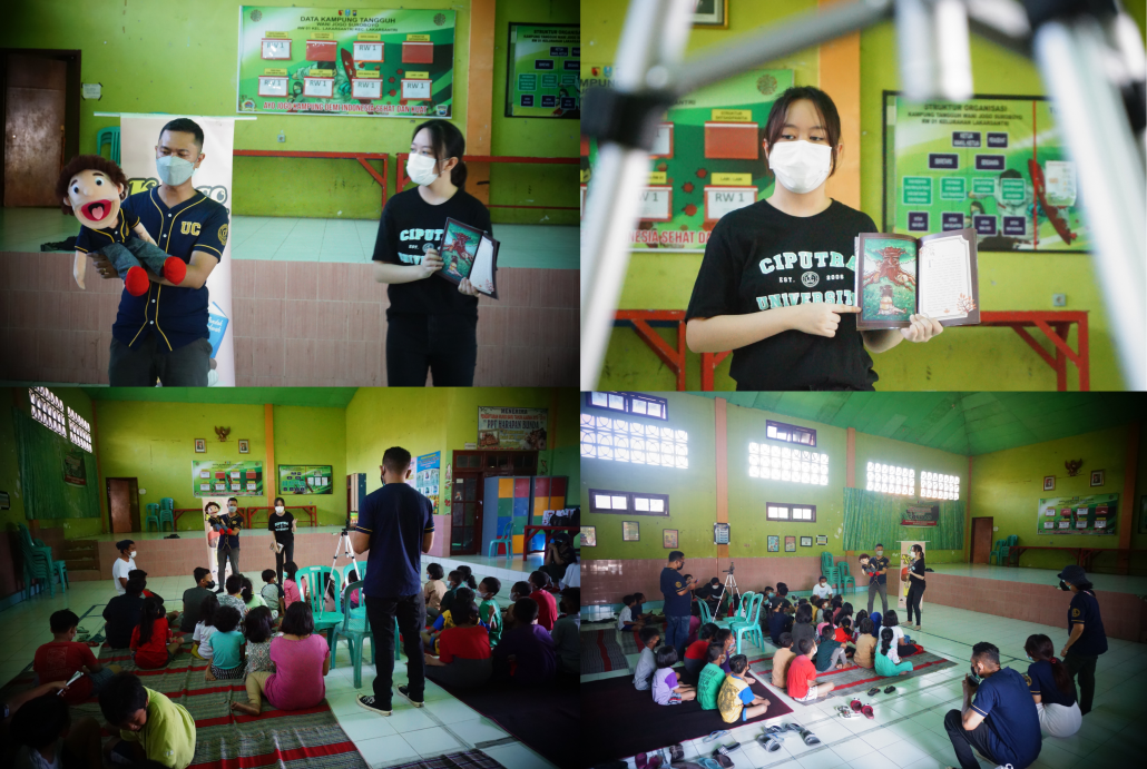 Dipimpin oleh kak Lydia Emma (Mahasiswa MCM-UC) acara dimulai dengan ice breaking “Simon says” yang bertujuan untuk membangkitkan semangat anak-anak untuk mengikuti acara. Setelah ice breaking, Library Universitas Ciputra membacakan dongeng dengan sebuah boneka tangan Library UC, yang diberi nama Doelib (Doelore Library). Dongeng yang diberikan diambil dari sebuah buku karya mahasiswa Universitas Ciputra hasil belajar di library UC yang berjudul “Destiny’s Calling”. Penulisnya adalah Patricia Juarsa (0206041810053), Azhari Almirana (0206041810057), dan Jessica Bryanna Stanley (0206041810061). Ketiganya berperan sebagai penulis cerita dan illustrator. Buku ini merupakan cerita fiksi yang terinspirasi dari cerita budaya Panji dan beragam artefak budaya Majapahit yang dipamerkan di dalam Museum Pusat Kajian Budaya Kreatif Universitas Ciputra yang bertempat di Perpustakaan Universitas Ciputra Surabaya. Semua anak-anak yang ikut serta sangat antusias mendengarkan dari awal hingga akhir. Dongeng disampaikan secara interaktif sehingga tidak membosankan. Dengan dongeng, anak-anak diharapkan akan lebih mudah menangkap pesan moral dari dongeng yang di ceritakan. Sehabis dongeng, anak-anak juga diberikan kuis berhadiah mengenai dongeng yang sudah diceritakan.