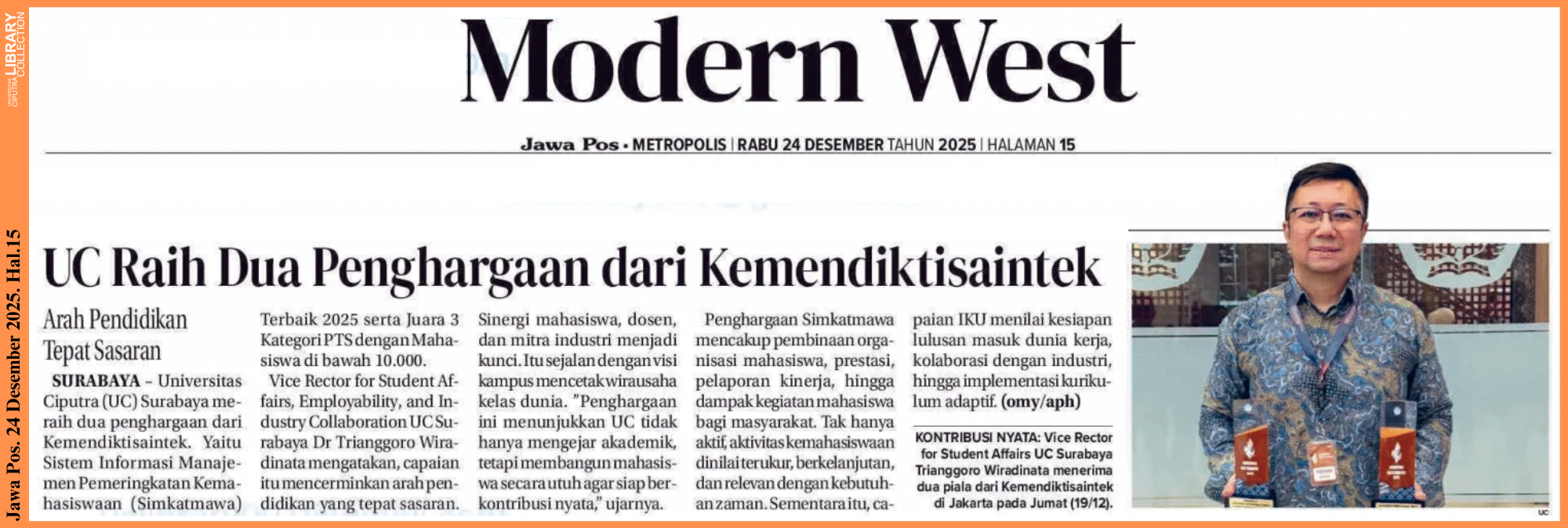 Universitas Ciputra (UC) Surabaya meraih dua penghargaan dari Kemendiktisaintek. Yaitu Sistem Informasi manajemen Pemeringkatan Kemahasiswaan (Simkatmawa) terbaik 2025 serta Juara 3 Kategori PTS dengan Mahasiwa di bawah 10.000.