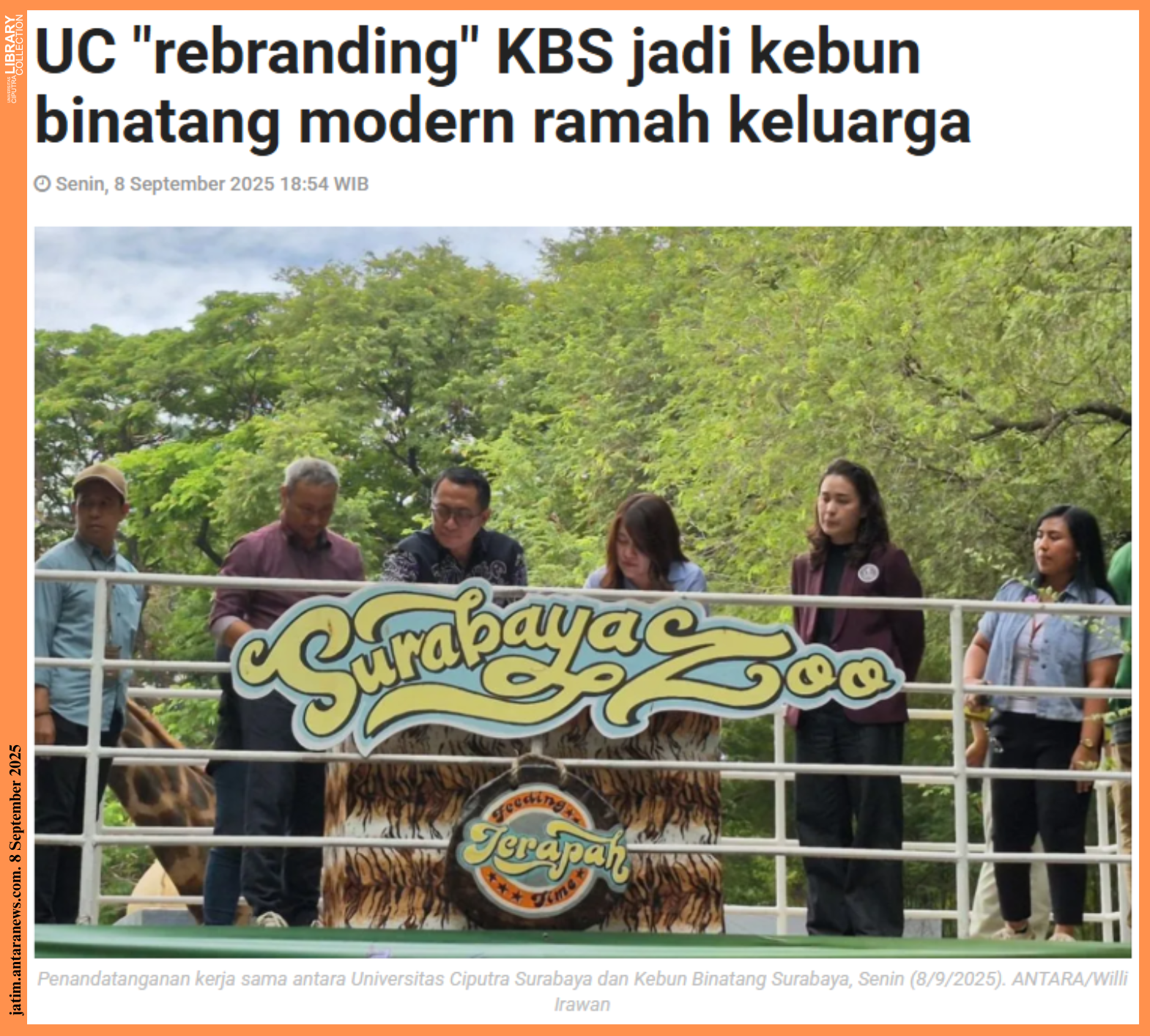 Surabaya (ANTARA) – Universitas Ciputra (UC) melalui School of Creative Industry (SCI) resmi menjalin kerja sama dengan Kebun Binatang Surabaya (KBS) untuk proyek rebranding dan revitalisasi KBS agar naik kelas menjadi kebun binatang modern ramah keluarga.