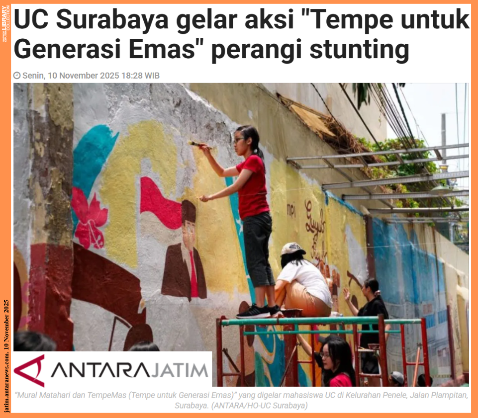 Surabaya (ANTARA) – Universitas Ciputra (UC) Surabaya memperingati Hari Pahlawan dengan aksi nyata melawan stunting melalui kegiatan “Mural Matahari dan TempeMas (Tempe untuk Generasi Emas)” di Kelurahan Penele, Jalan Plampitan, Surabaya.