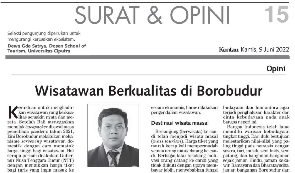 Wisatawan Berkualitas di Borobudur. Kontan. 9 Juni 2022. Hal. 15. Dewa GS. HTB