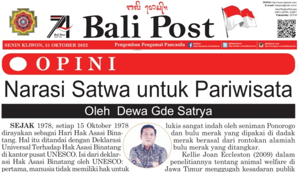 Narasi Satwa untuk Pariwisata. Bali Post. 31 Oktober 2022