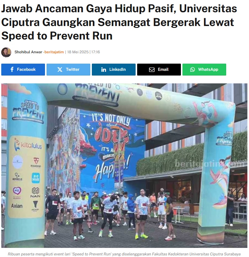 Jawab Ancaman Gaya Hidup Pasif, Universitas Ciputra Gaungkan Semangat Bergerak Lewat Speed to Prevent Run. beritajatim.com. 18 Mei 2025