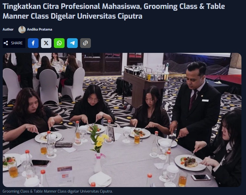 Tingkatkan Citra Profesional Mahasiswa, Grooming Class & Table Manner Class Digelar Universitas Ciputra. zcampus.indozone. 8 Mei 2025