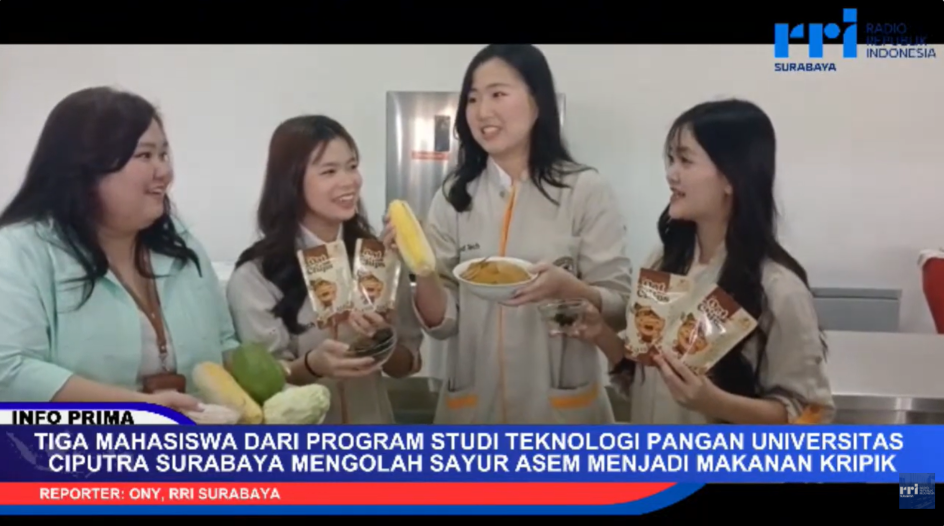 Tiga Mahasiswa dari Program Studi Teknologi Pangan Universitas Ciputra Surabaya Mengolah Sayur Asem Menjadi Makanan Kripik. Youtube.com. 10 Desember 2025