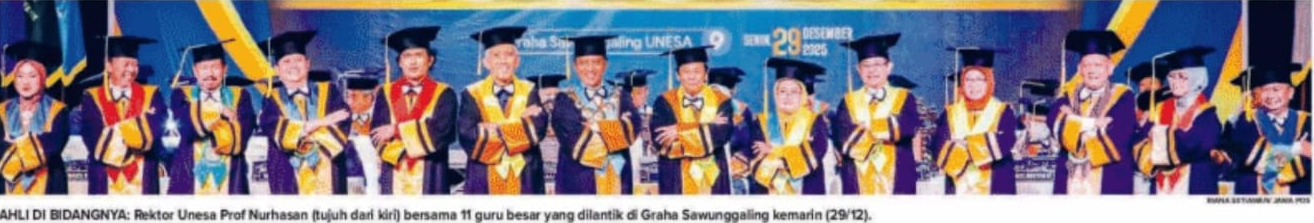 Unesa Kukuhkan 11 Guru Besar. Jawapos. 30 desember 2025. Hal.15