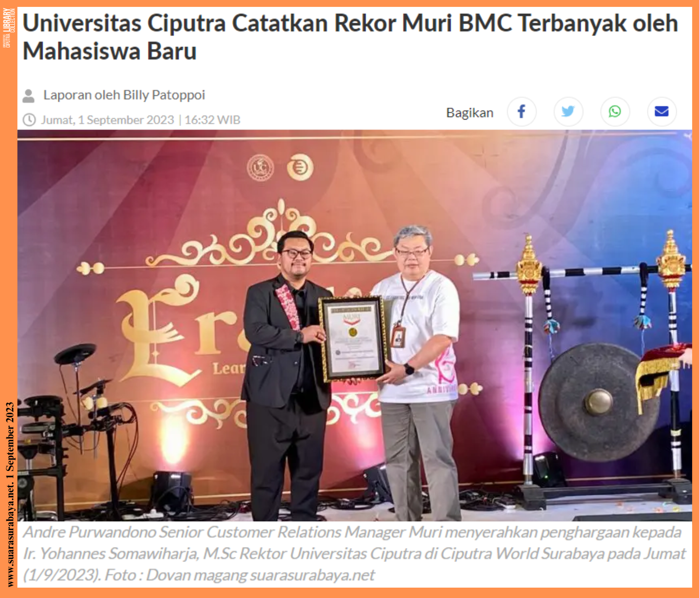Universitas Ciputra Surabaya mencatatkan rekor baru Business Model Canvas (BMC) terbanyak yang pernah dibuat oleh mahasiswa baru. Museum Rekor Dunia Indonesia (Muri) mencatat total ada 1.307 BMC.